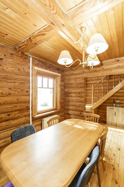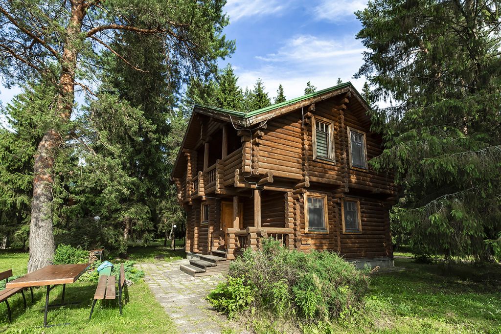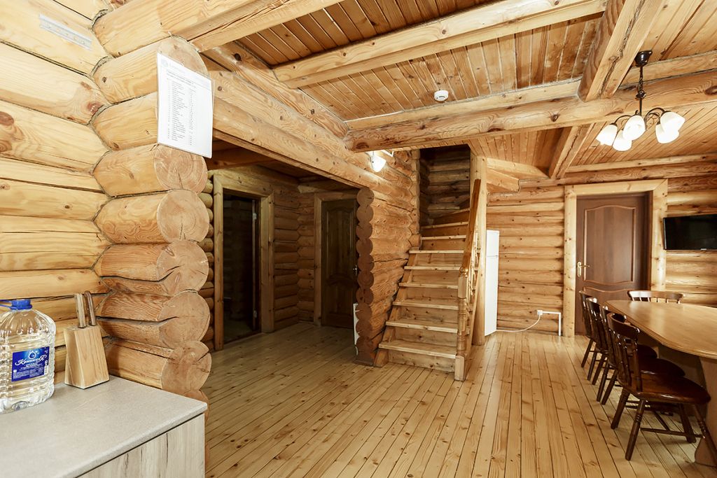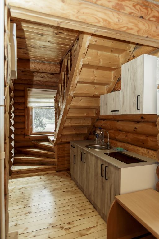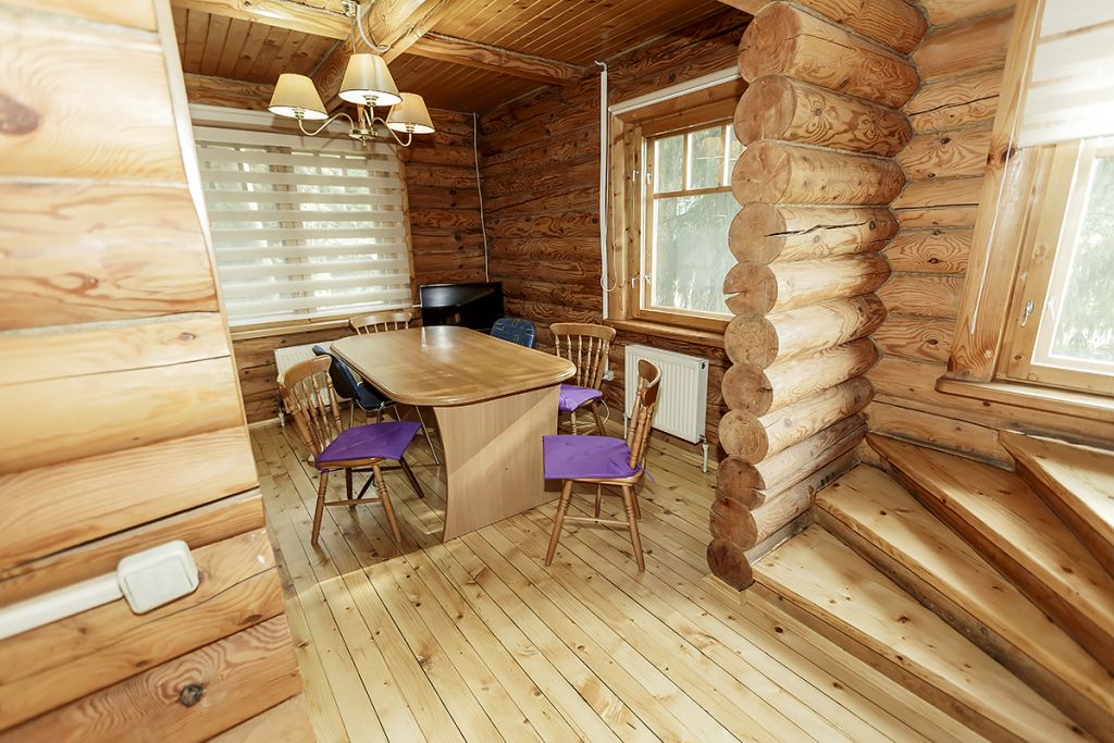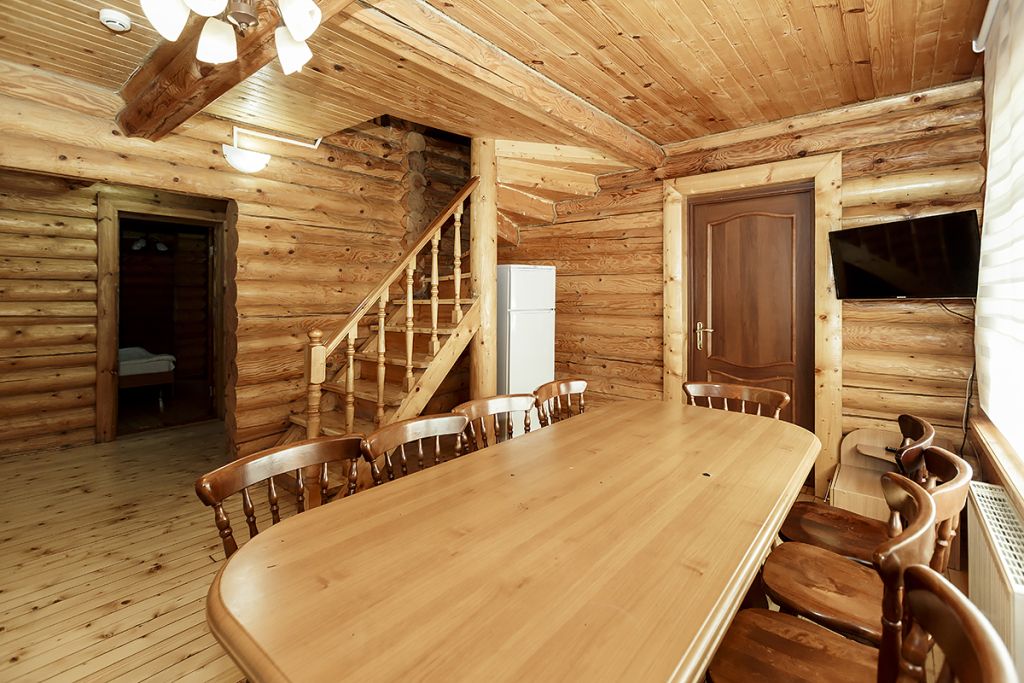 Деревянный коттедж из двух этажей с балконом, рассчитанный на 6-10 человек. В доме имеется кухня, два холла, два санузла, три спальни и балкон.