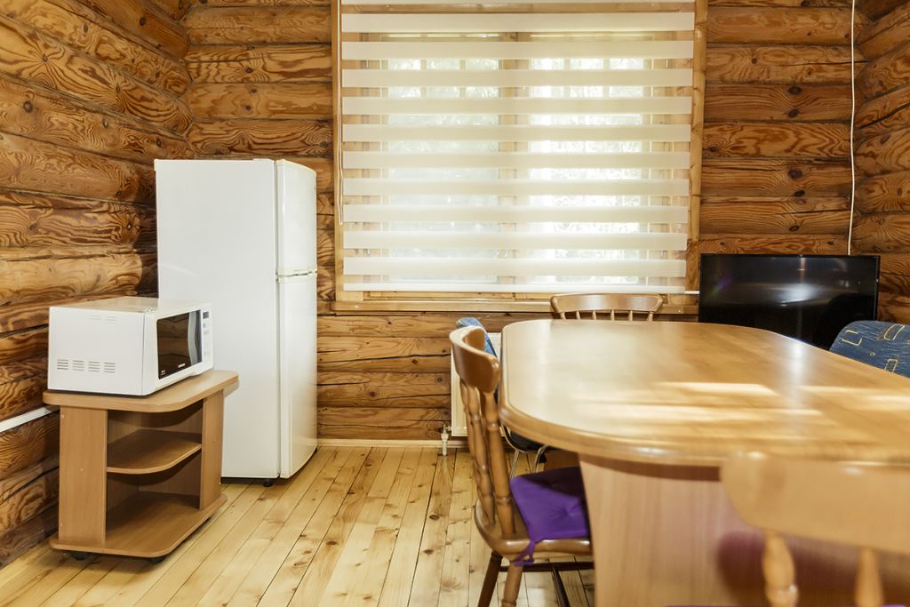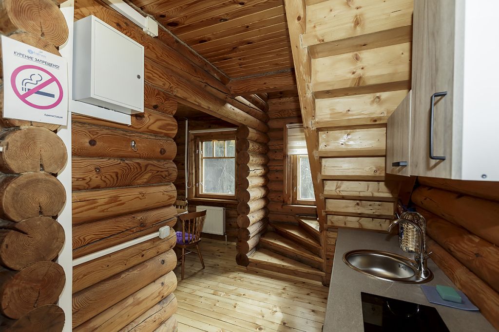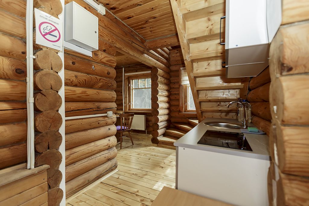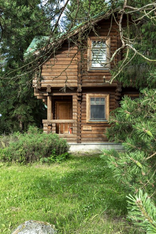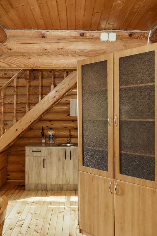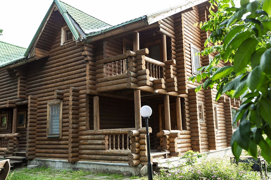 Деревянный коттедж из двух этажей с балконом, рассчитанный на 6-10 человек. В доме имеется кухня, два холла, два санузла, три спальни и балкон.
