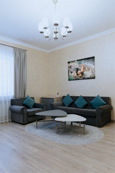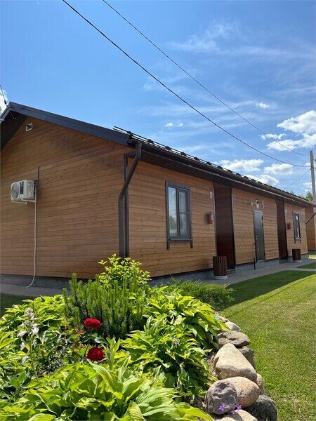 На территории загородного комплекса отдыха располагается коттедж дуплекс в непосредственной близости от главного ресторана и имеет два отдельных входа для размещения двух разных компаний. Внутри коттеджа расположены две спальни: одна с двуспальной кроватью, другая с двумя односпальными. В гостиной зоне находится уютная кухонная зона. Дополнительное спальное место — односпальный диван.