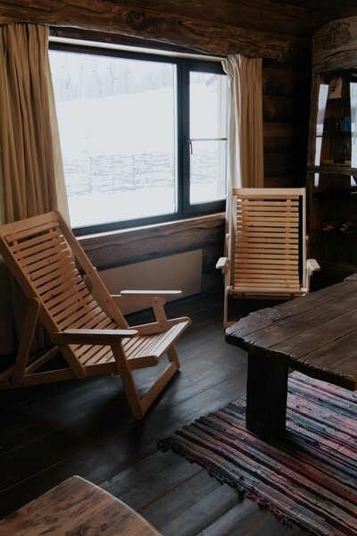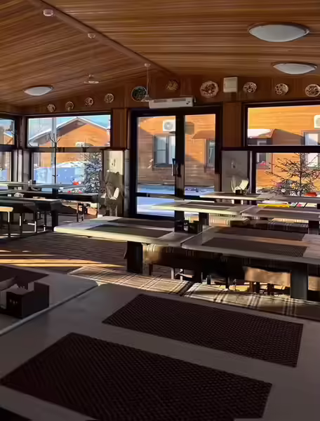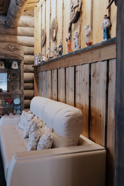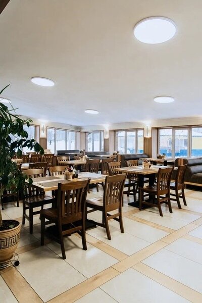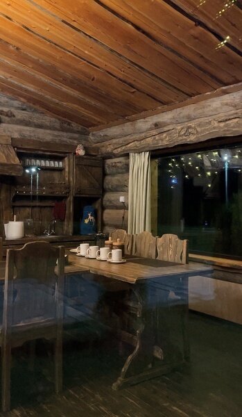 Интерьер, оформленный картинами ручной работы, люстрой из натуральных рогов и эко-мебелью, поражает своей самобытностью и вниманием к деталям. Расположившись у окон, Вы сможете насладиться изысканной кухней в окружении величественных деревьев, пения птиц и неповторимых образов природы, подарив себе незабываемые впечатления.