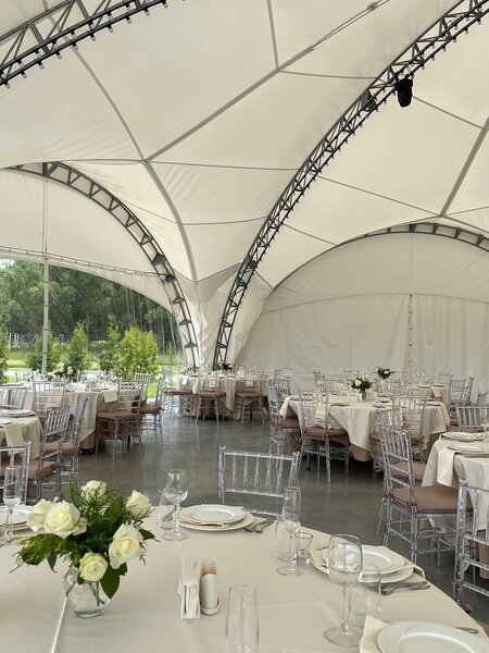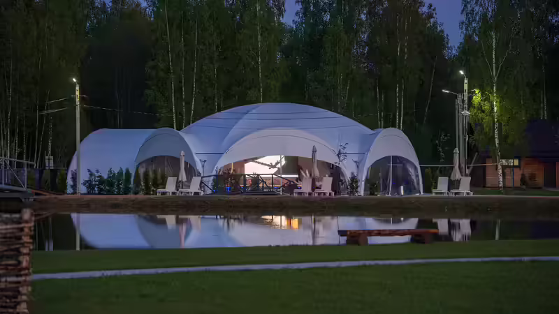 Просторный шатер площадью 260 квадратных метров с легкостью вместит до 300 гостей, став идеальной локацией для Вашего мероприятия любого формата — от ретрита до грандиозной свадьбы. Помимо основного зала, шатер включает в себя два дополнительных модуля по 50 квадратных метров каждый: один из них оборудован под кухню, а во втором располагается сцена для ведущего и диджея.
