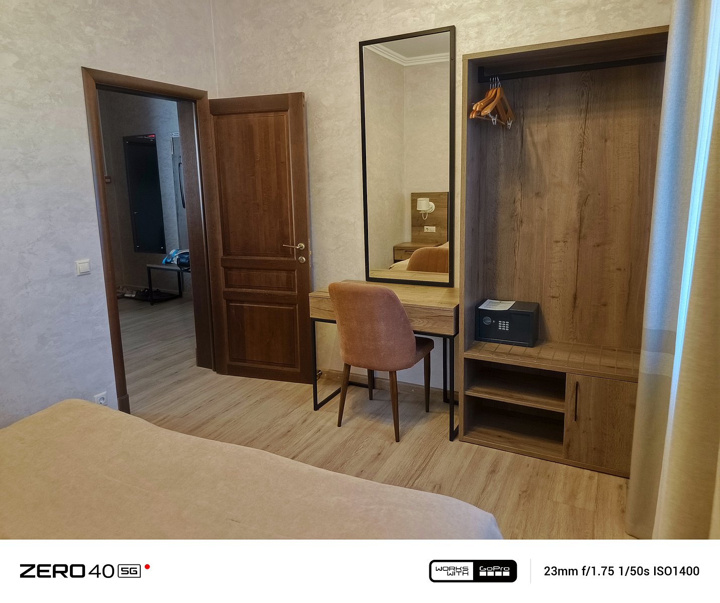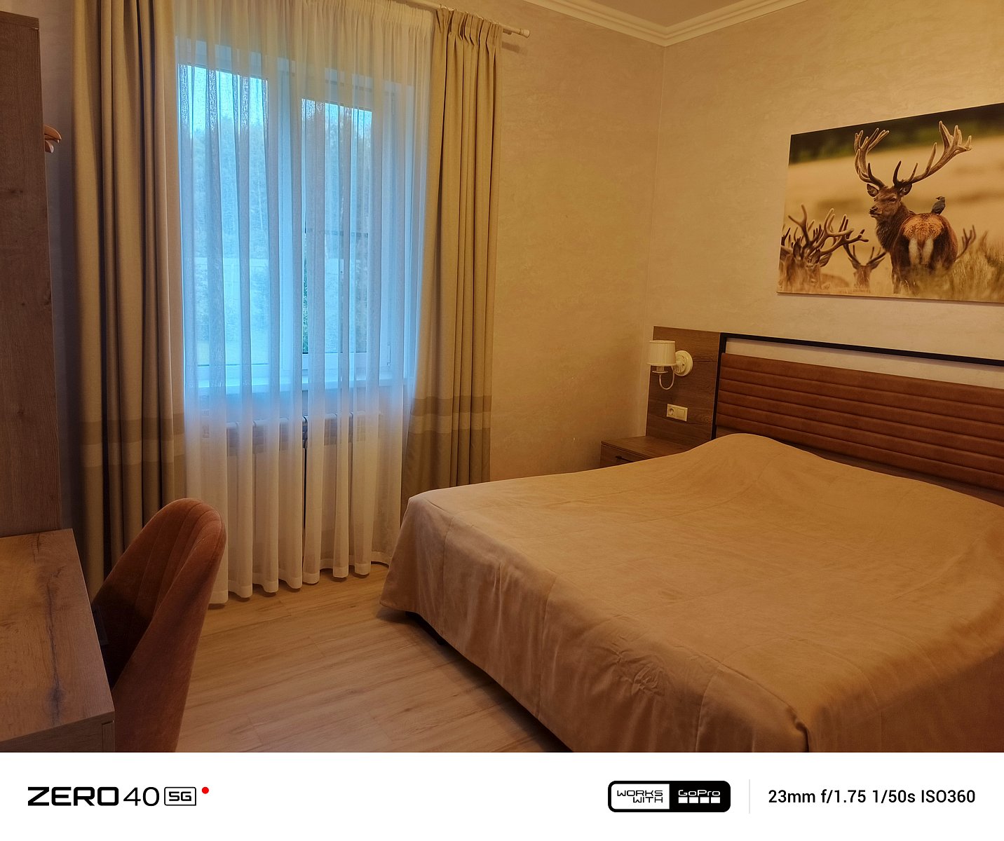 На территории расположен гостиничный комплекс, состоящий из 9 уютных двухместных номеров. В данном номере есть двуспальная кровать King-size.