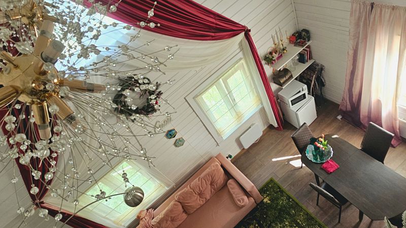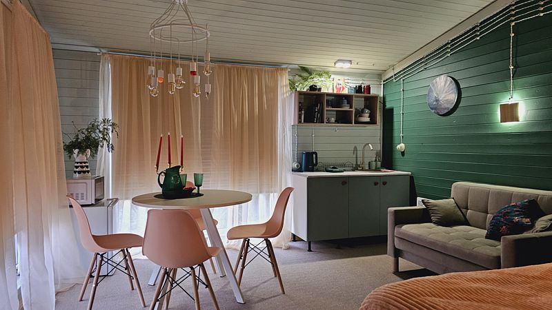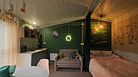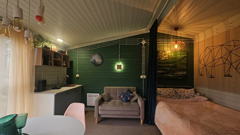 В одном пространстве размещены: кухонная зона: столовая, гостиная, спальня. Отдельно: Коридор, Ванная, Терраса, Мангальная зона, Парковка.