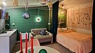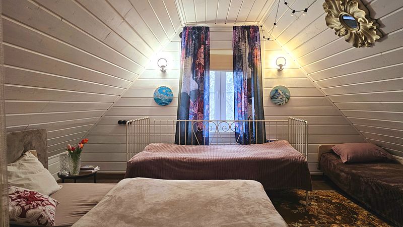 в каждой спальне двуспальная кровать, диван на двоих в гостиной, раскладушка, односпальная кровать с бортиками — подойдёт для младенцев.
