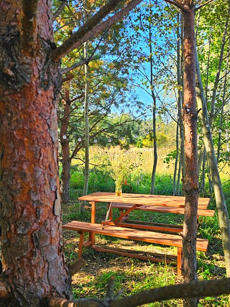 На территории базы оборудованы специальные зоны отдыха со столом и скамьями, где можно отдохнуть на свежем воздухе среди живописного леса.