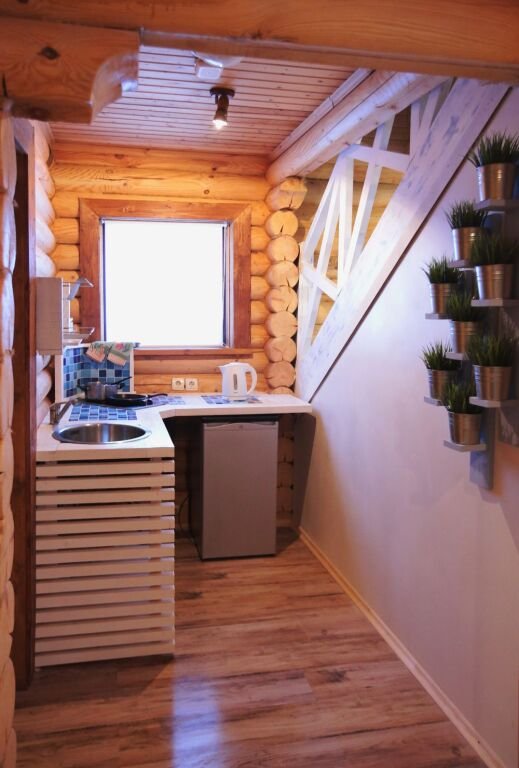 Уютный двухэтажный домик для двоих с камином. На первом этаже кухня и гостиная зона с телевизором и диваном. На втором этаже спальня с большой кроватью и прекрасным видом из окна.