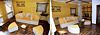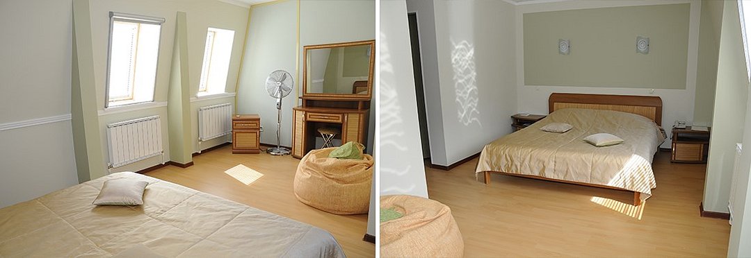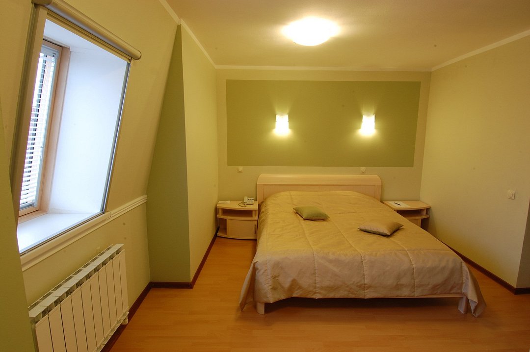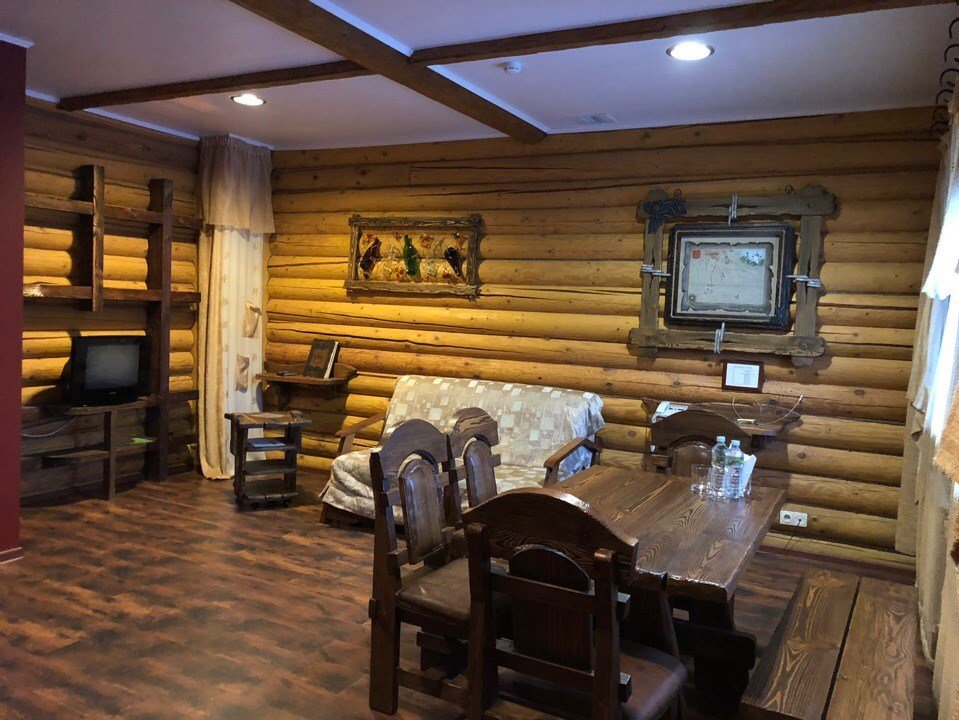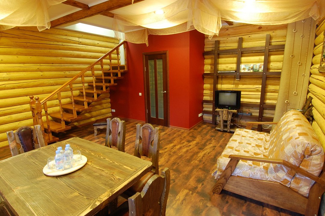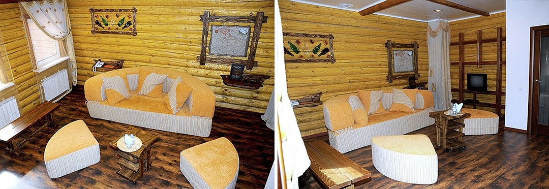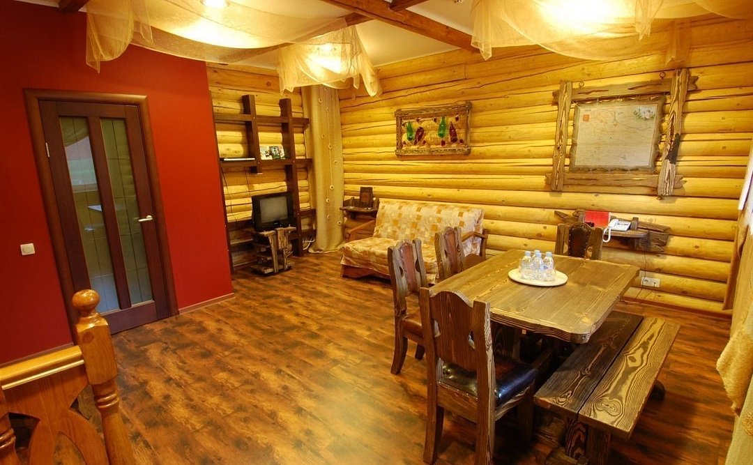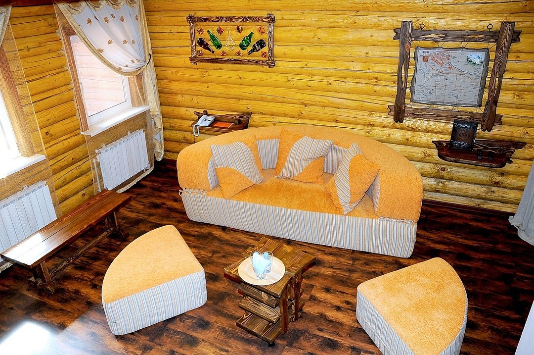 На первом этаже расположена гостиная с деревянной фактурой в интерьере. Гостиная оснащена уютным диваном-кроватью, на котором с комфортом могут разместиться двое гостей. На втором этаже спальня с двуспальной кроватью, большой санузел с чугунной ванной и душевой кабиной. Белье из шелковистого сатина обеспечат прекрасный сон. Оснащение номера/услуги в номере: телевизор; телефон; бесплатный высокоскоростной интернет (Wi-Fi); фен; индивидуальные принадлежности (халат, полотенца, гель, шампунь, зубной набор, мыло, бритвенный набор, средство для обуви); электрический чайник; мини - бар (за доп. стоимость); заказ в номер блюд и напитков из ресторана (+10% к стоимости меню); дополнительный комплект посуды/приборов (бесплатно, по запросу).Услуги и удобства