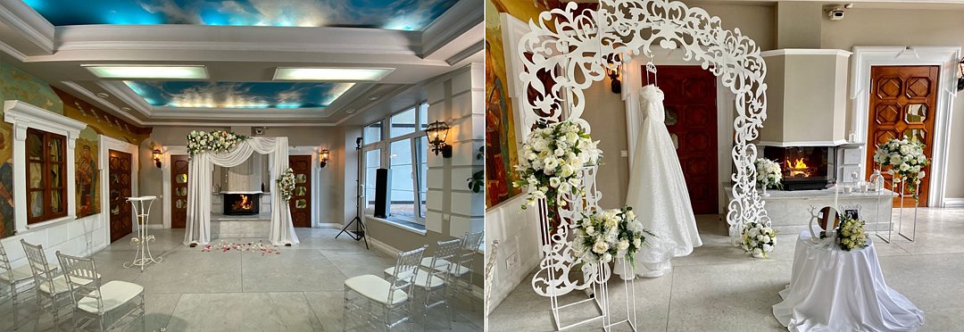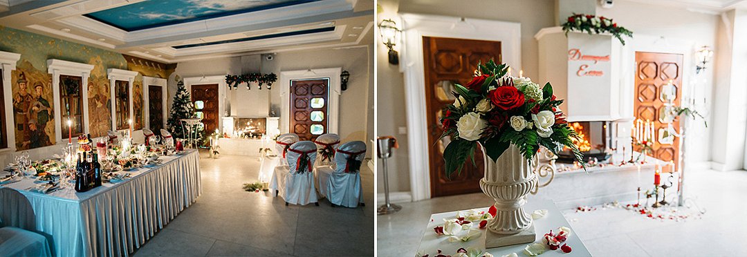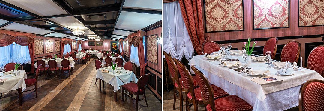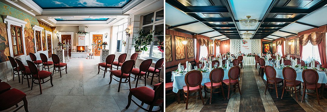 Интерьер зала выполнен в строгом классическом стиле. Люстры и бра из настоящего хрусталя. Эксклюзивные чугунные батареи. Мебель, изготовленные на той же фабрике, что и стулья из легендарного советского кинофильма «12 стульев».