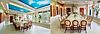 Другая часть зала – это панорамные окна, которые наполнили его солнечным светом и позволили любоваться ландшафтным дизайном территории комплекса.
