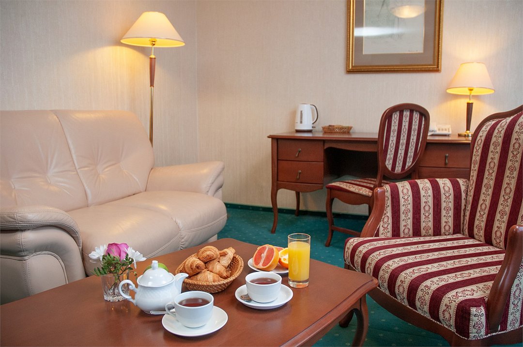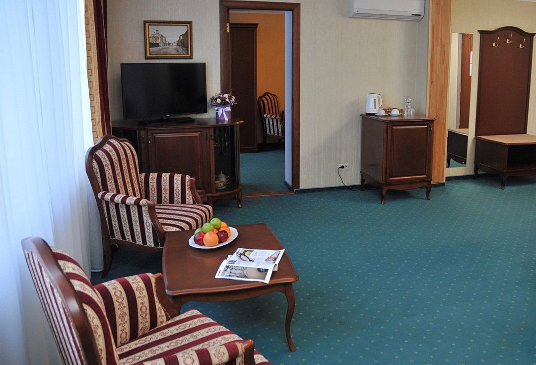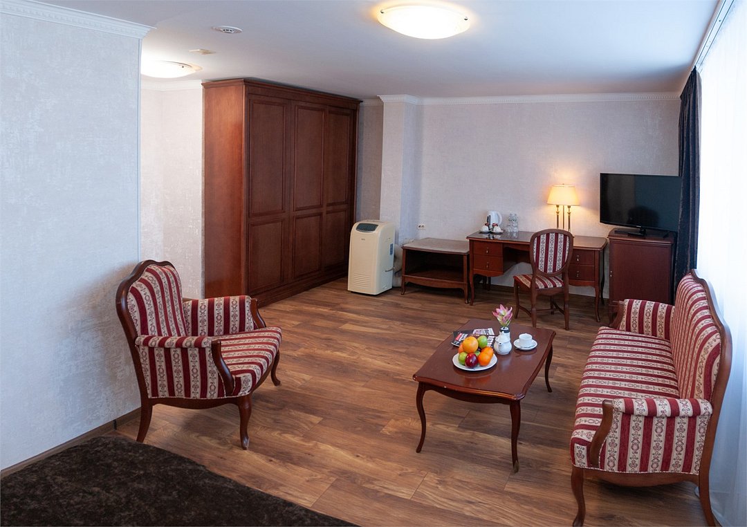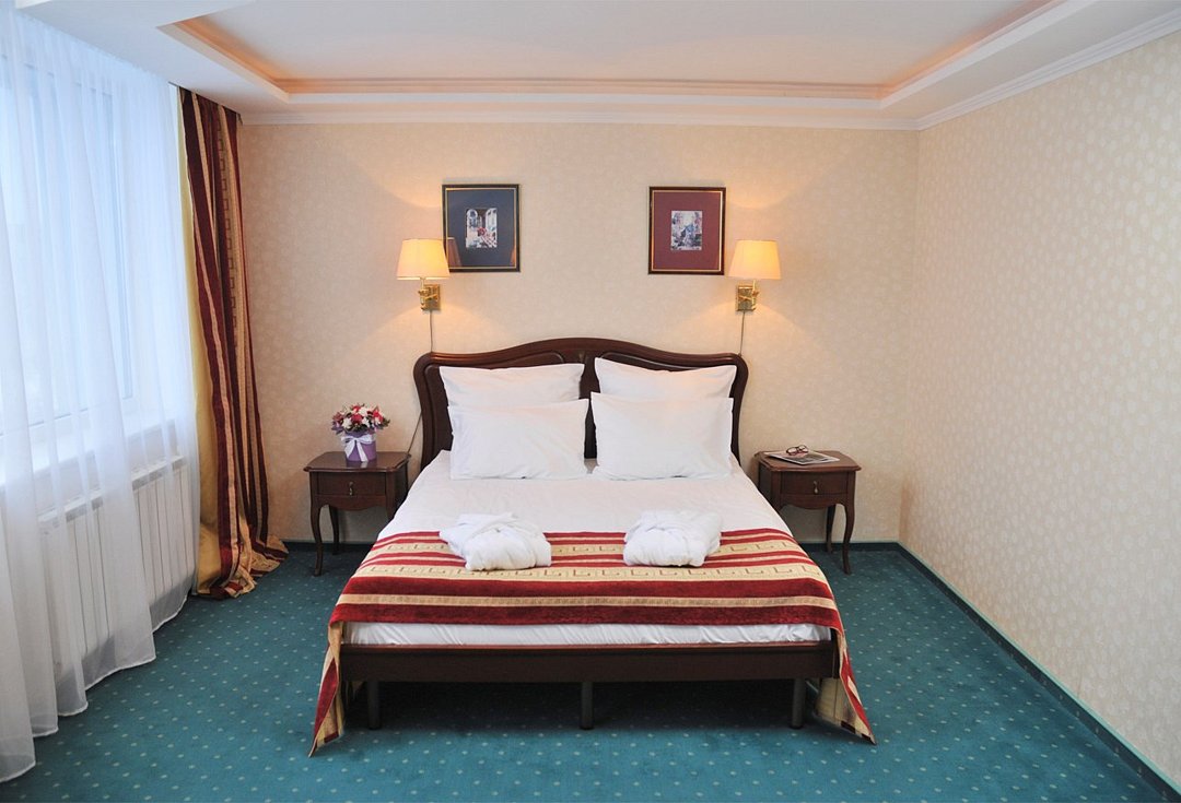 Гостиница Калуга предлагает номера класса "Люкс". Просторные номера, разделенные на две зоны проживания: гостиная и спальня с большой двуспальной кроватью и французской софой. В номерах есть всё необходимое для комфортного пребывания: обеденный стол, cейф, система кондиционирования, утюг, рабочий стол, гладильные принадлежности, диван, шкаф/гардероб, душ, ванна, фен, халат, туалетные принадлежности, тапочки, телефон, плазменный телевизор с кабельным телевидением, электрический чайник, набор посуды, бесплатный WI-FI доступ в интернет, услуга "звонок-будильник", бутылка воды в качестве комплимента от отеля, платный мини –бар. Гостям предоставляется бесплатная, охраняемая парковка.Услуги и удобства