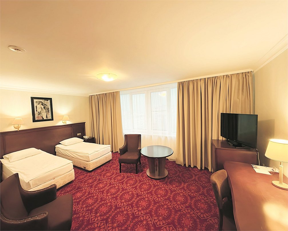 телевизор, Wi-Fi, телефон, кондиционер, фен, ванная комната, косметические средства, две односпальные кровати, письменный стол, сейф, вид на городВ гостиничном номере