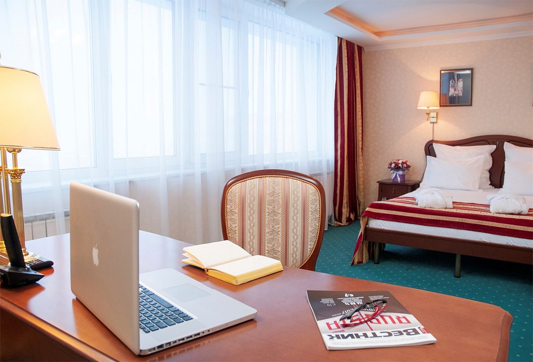 телевизор, Wi-Fi, телефон, кондиционер, фен, ванна, косметические средства, кровать «Queen size», письменный стол, сейф, вид на городВ гостиничном номере
