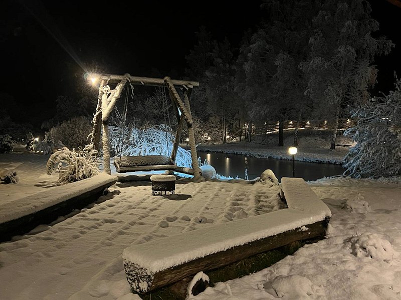 Зимой пруд Агроусадьбы превращается в каток. Не забывайте брать с собой коньки. Вечером включаются фонари — настоящая зимняя сказка.