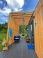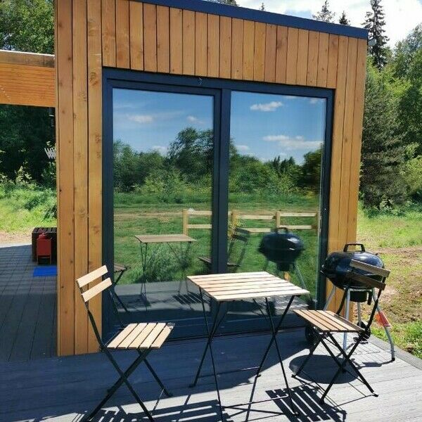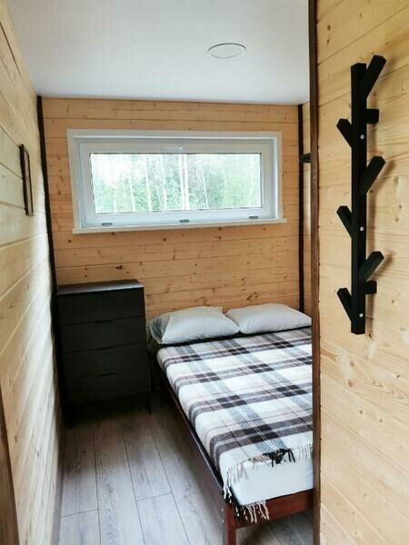 Отдельностоящий компактный двухместный Глэмп-домик с двуспальной кроватью и собственной верандой с панорамными окнами в 10 метрах от реки. Возможно размещение втроем - гостиная оборудована раздвижным креслом. Санузел оборудован душевой кабиной и феном. Домик укомплектован садовой мебелью, барбекю и играми. Из панорамных окон открывается шикарный вид на речку и закат. Идеально подходит для рыбаков и семейных пар с одним ребенком.