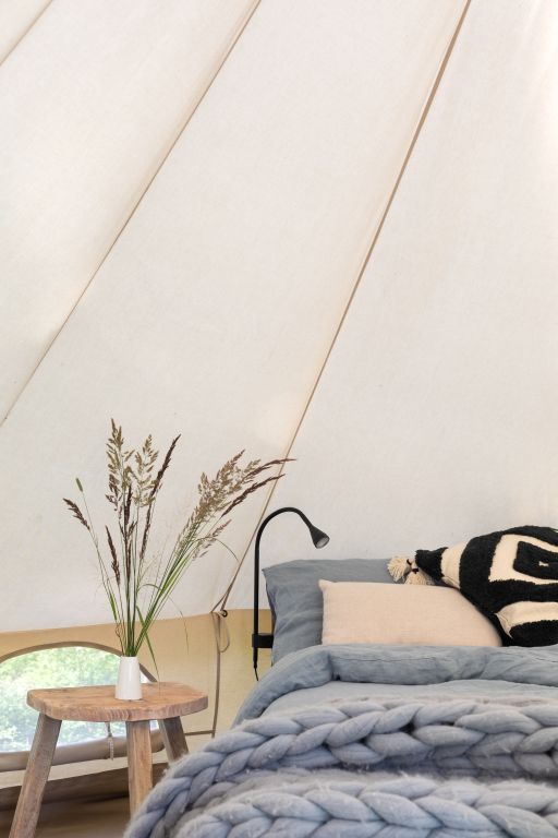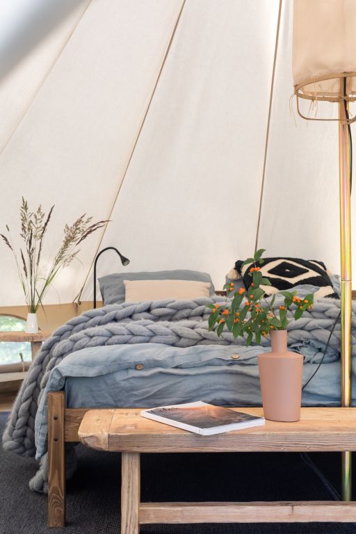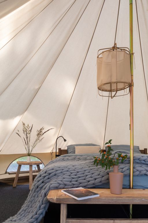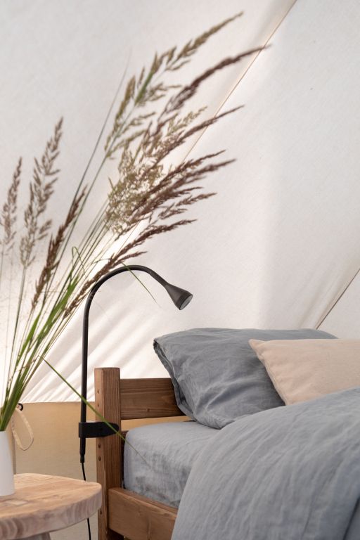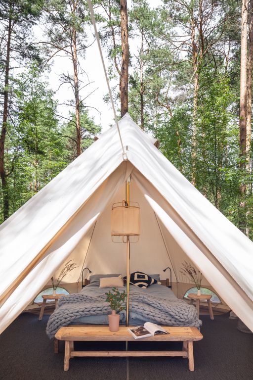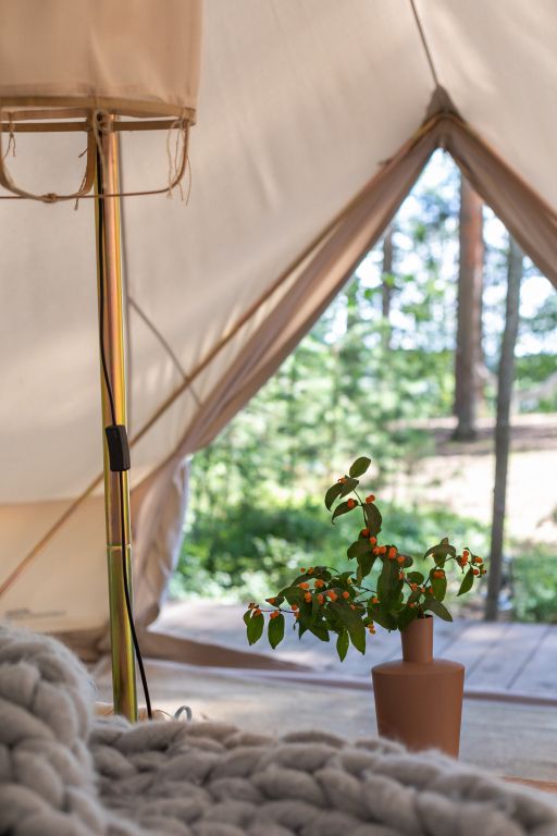 Палатки сочетают в себе функциональность и комфорт гостиничного номера, уютный интерьер в авторском стиле и максимальное приближение к природе. Каждая палатка располагается на индивидуальном деревянном помосте в небольшом удалении друг от друга. Тепло и комфорт обеспечивают обогреваемые кровати и печь-обогреватель.
