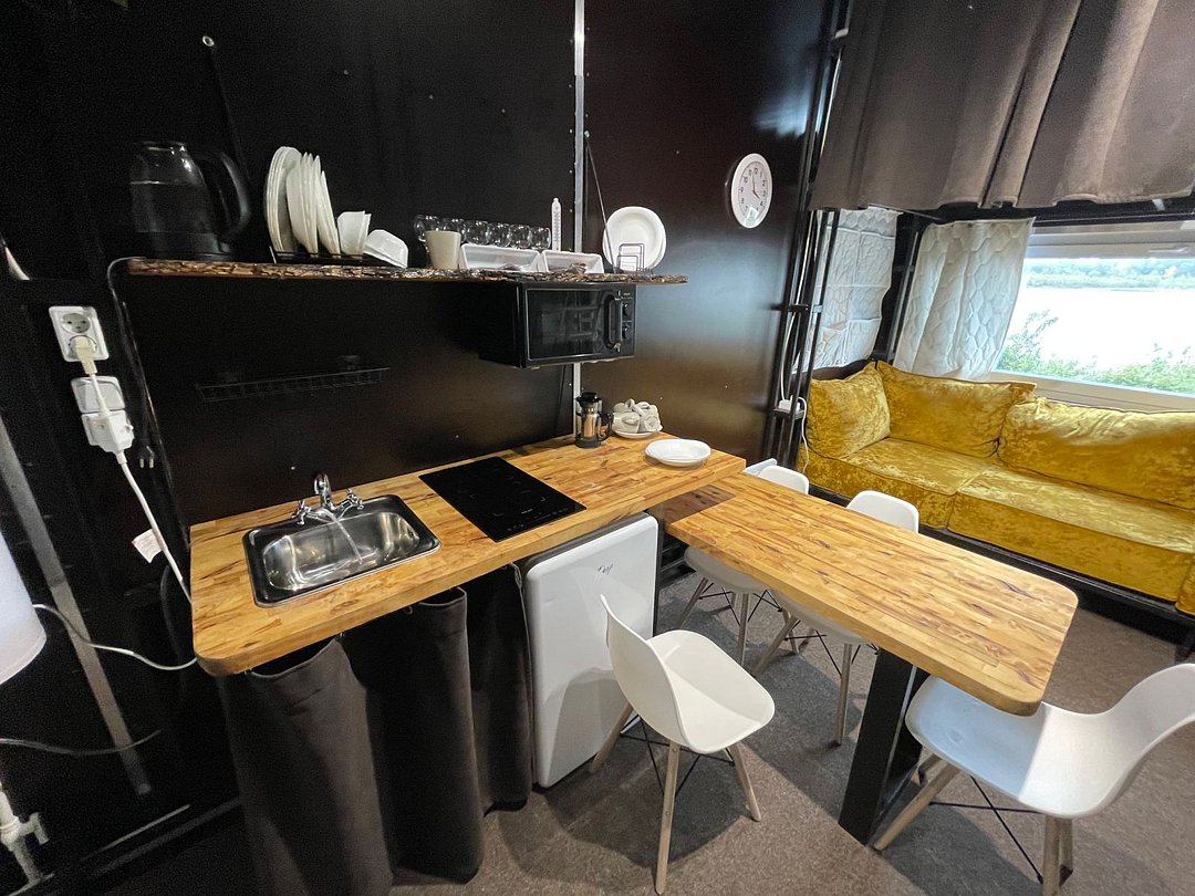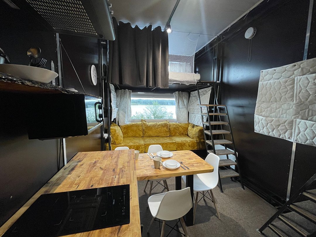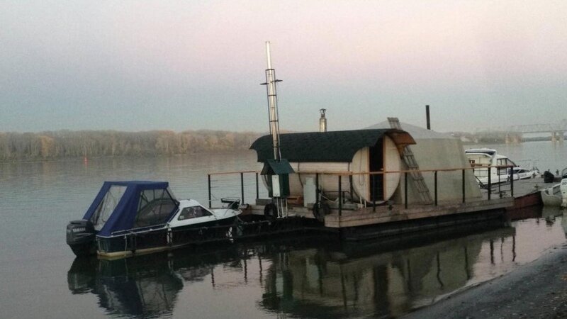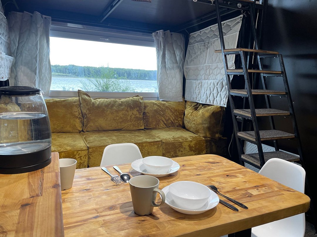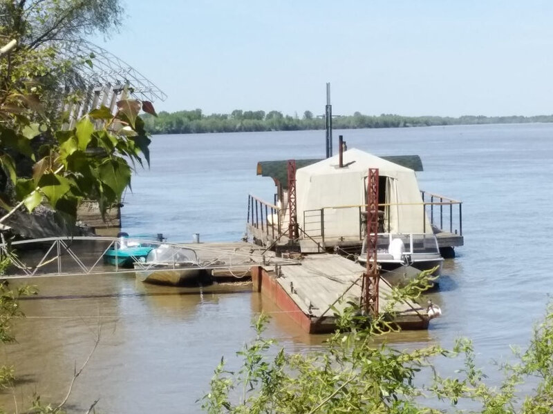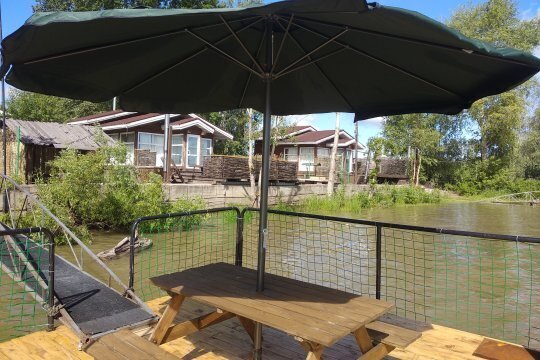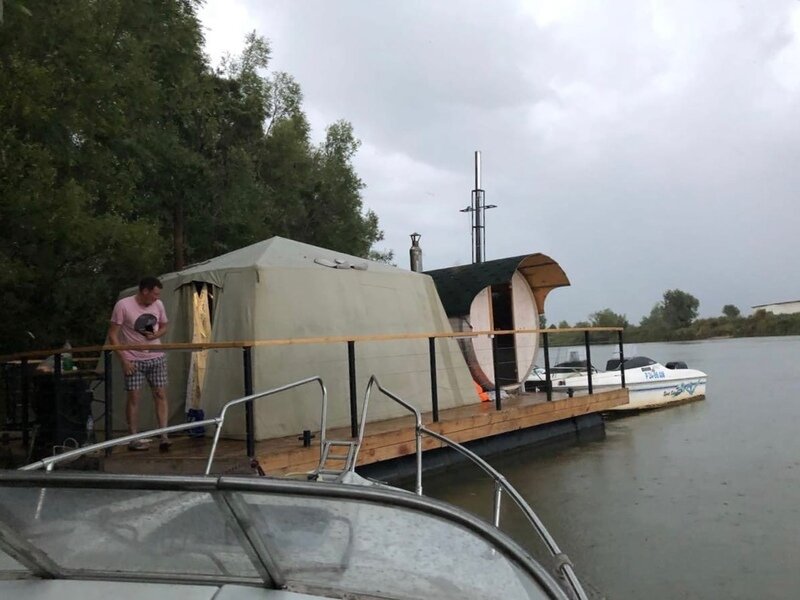 Плот для рыбаков, охотников и искателей приключений. Внутри есть 4 кровати, постельное белье, полотенца. А также плита, кухня, раковина, столовые приборы, посуда, печка-буржуйка, туалет (унитаз), вода 2 тонны. Электричество — есть освещение, можно зарядить телефон. На плоту есть баня!