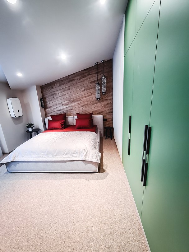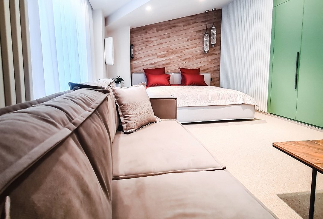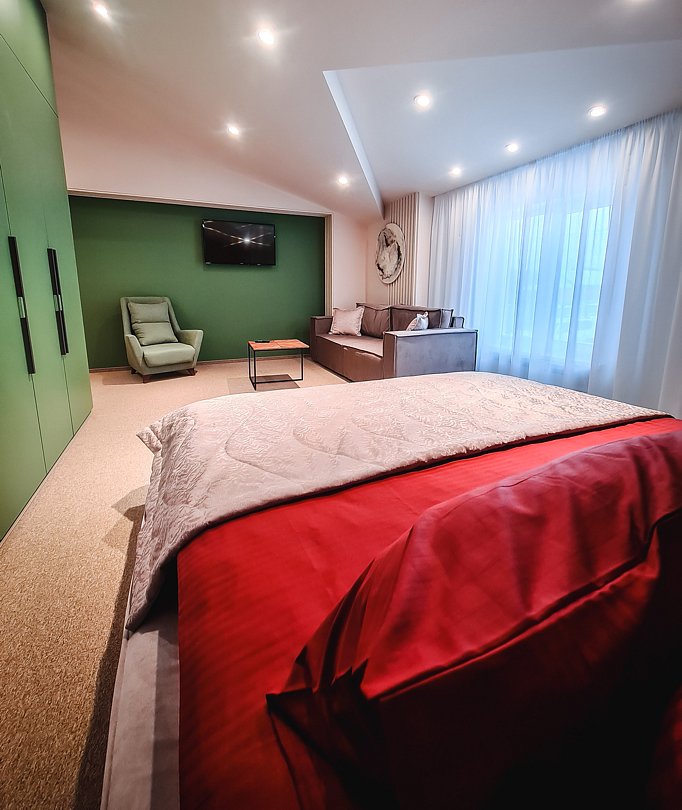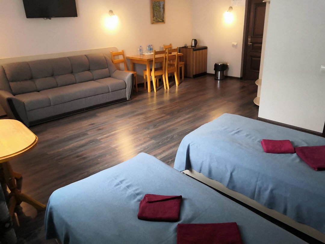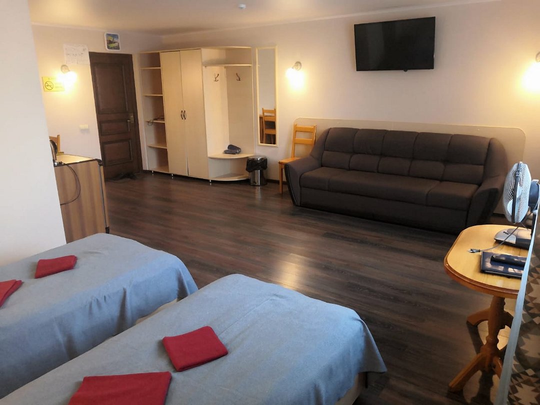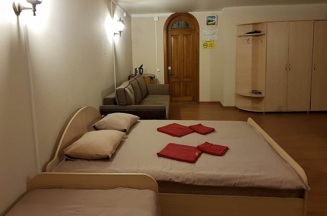 Двуспальная кровать, односпальная кровать, разборный коданый диван, душ, туалет