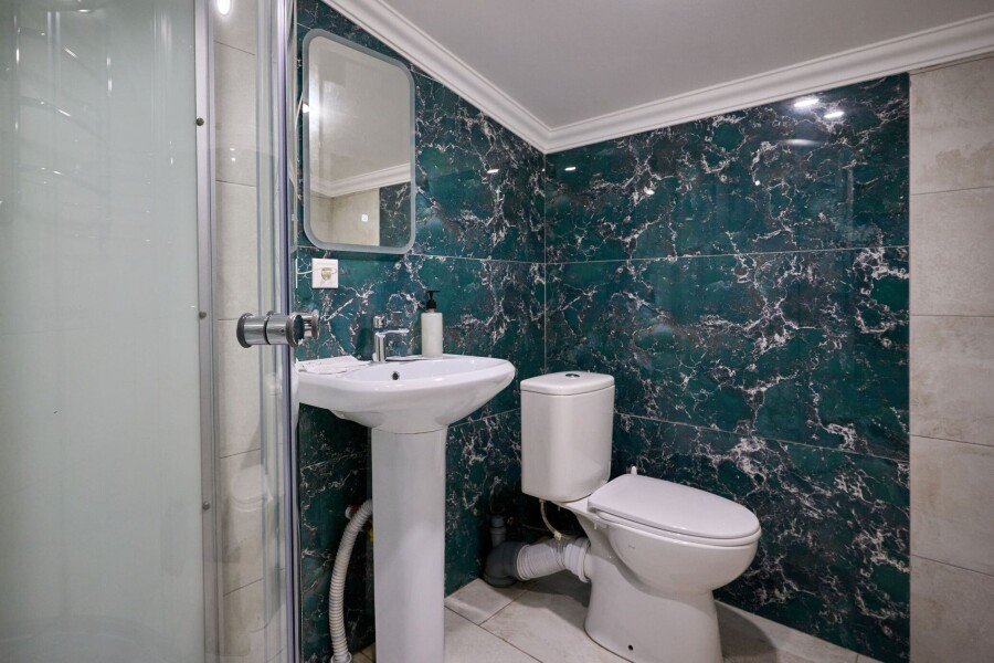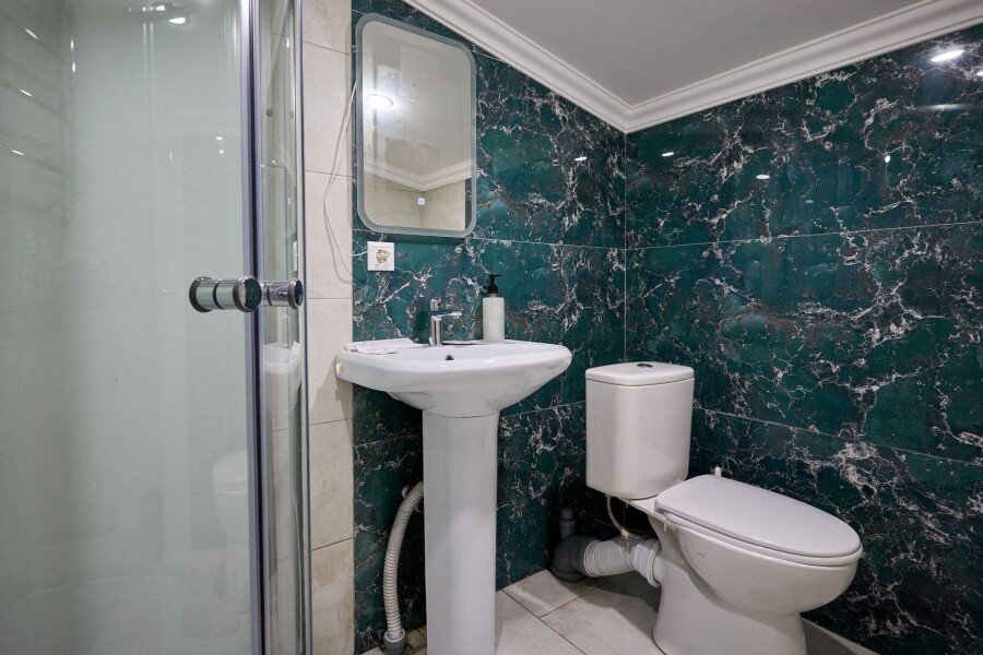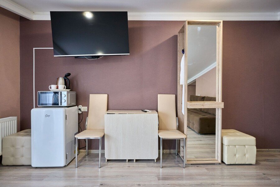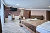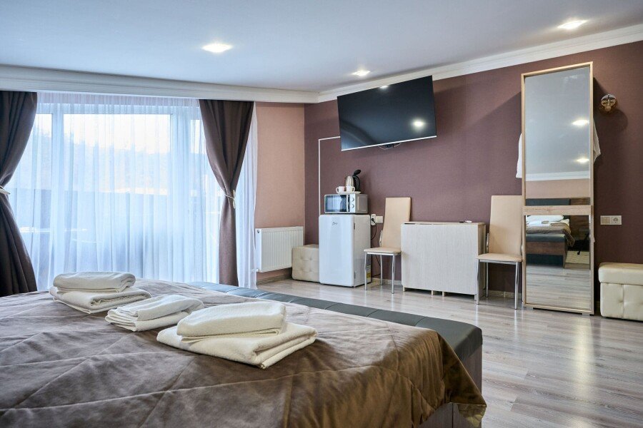 В номере: двуспальная кровать, диван-кровать, кондиционер, телевизор, холодильник, чайник, фен, зонт.