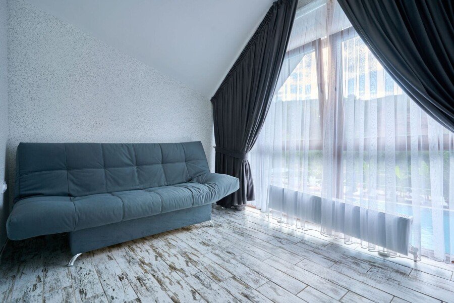 Просторный номер с двуспальной кроватью и диваном на лоджии, вместимостью до 4-х человек.
