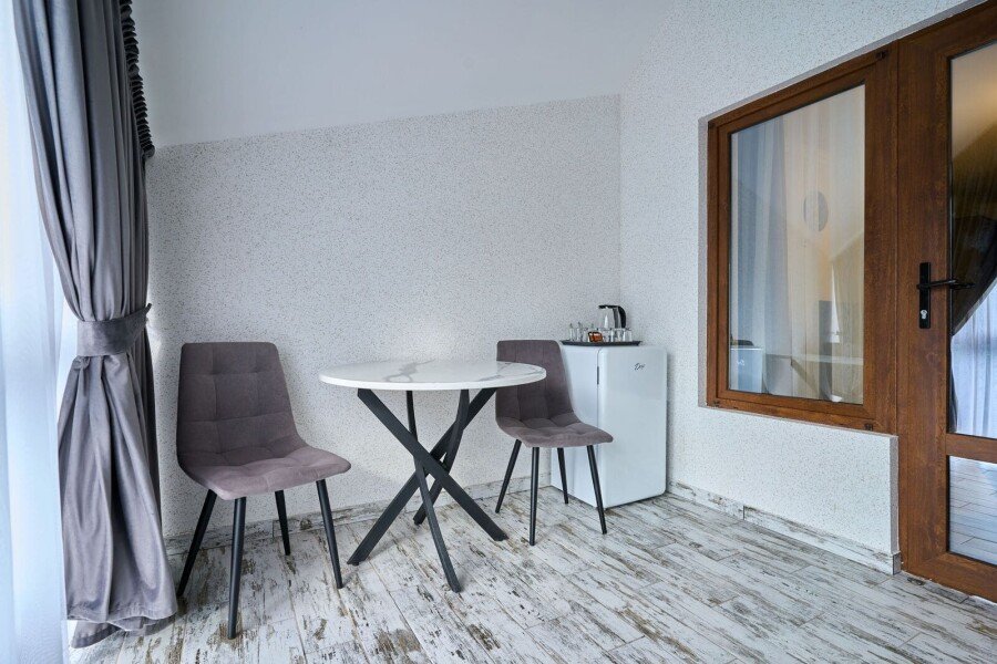 Номер состоит из спальной, ванной комнаты и балкона. В номере есть телевизор, стол, пуфик и прикроватные тумбочки. Ванная комната с раковиной и душем, также имеются индивидуальные наборы косметических средств для гостей. Стол, два стула, чайный набор, мини-холодильник. Отопление. Комфортную температуру в летнее время обеспечивает сплит система в номерах на втором этаже.