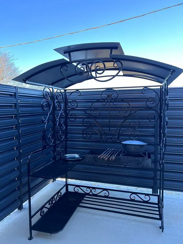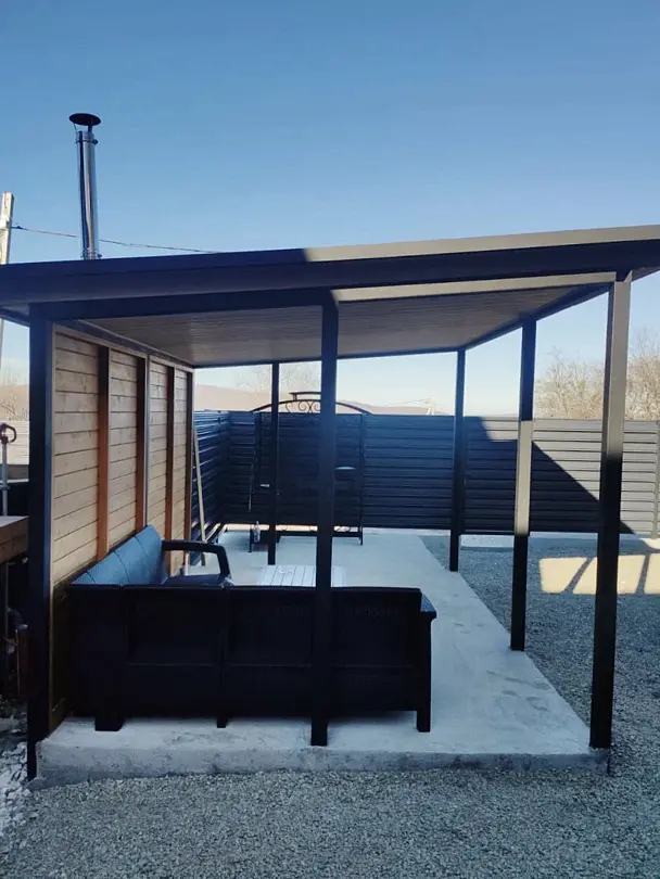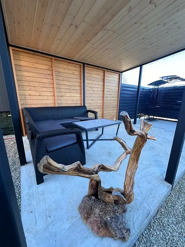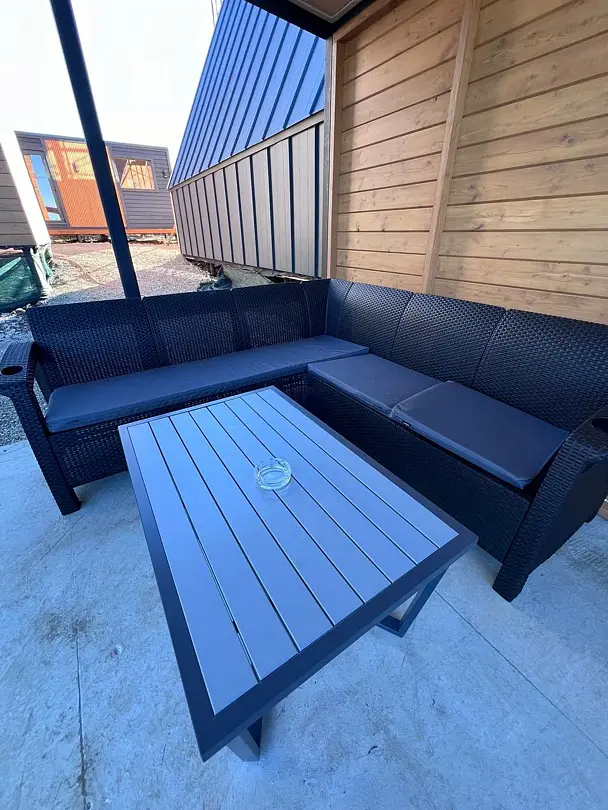 - просторная зона отдыха с удобными деревянными лавками и столом;