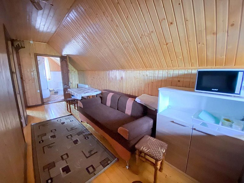 В коттедже два двухместных номера, в прихожей диван, беседка с видом на горы, удобства на этаже, холодильник, чайник.