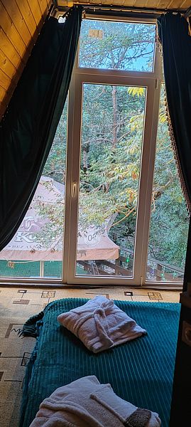 Двухэтажный просторный дом с 2-мя изолированными комнатами на 2-м этаже и общей кухней-гостиной на 1м этаже. Оснащен всем необходимым для комфортного отдыха. Дом находится в уникальном месте «Хаджохская теснина», с террасы дома открывается потрясающий панорамный вид на каньон реки бело, на пляж «Голубая лагуна», на горы и лес.