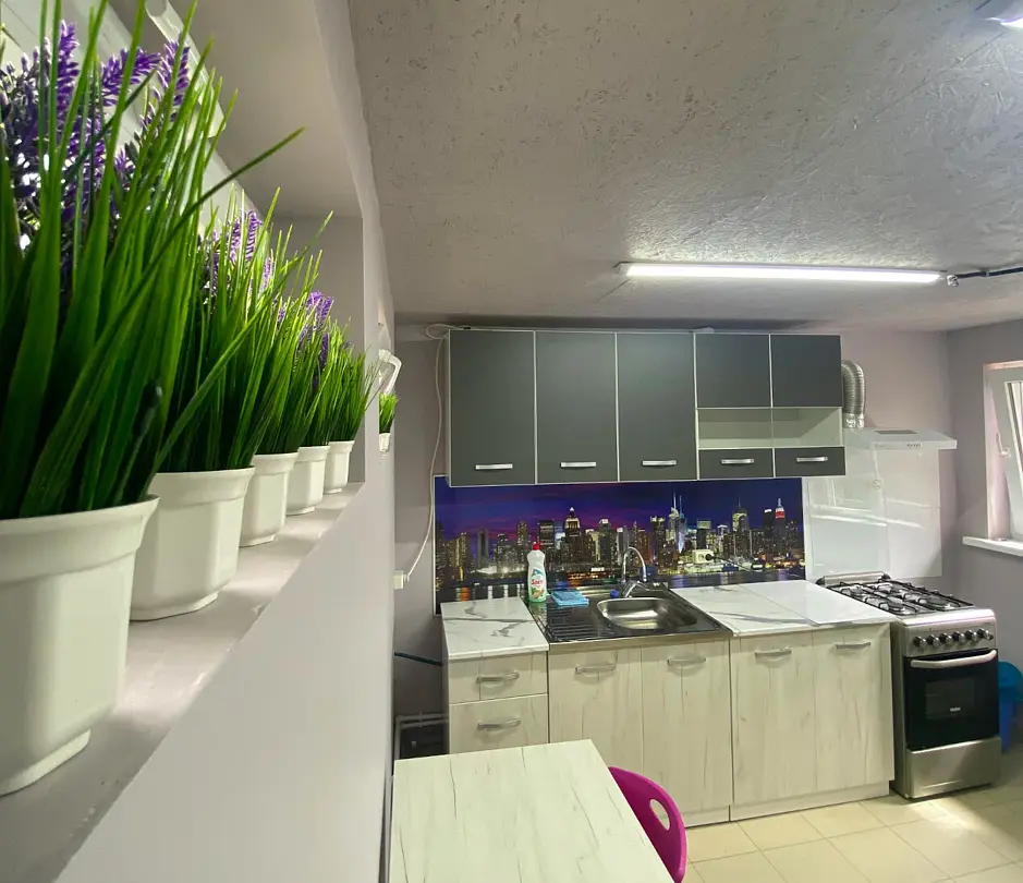 На кухне общего пользования есть: микроволновая печь, газовая плита, раковина, набор посуды для самостоятельного приготовления пищи.
