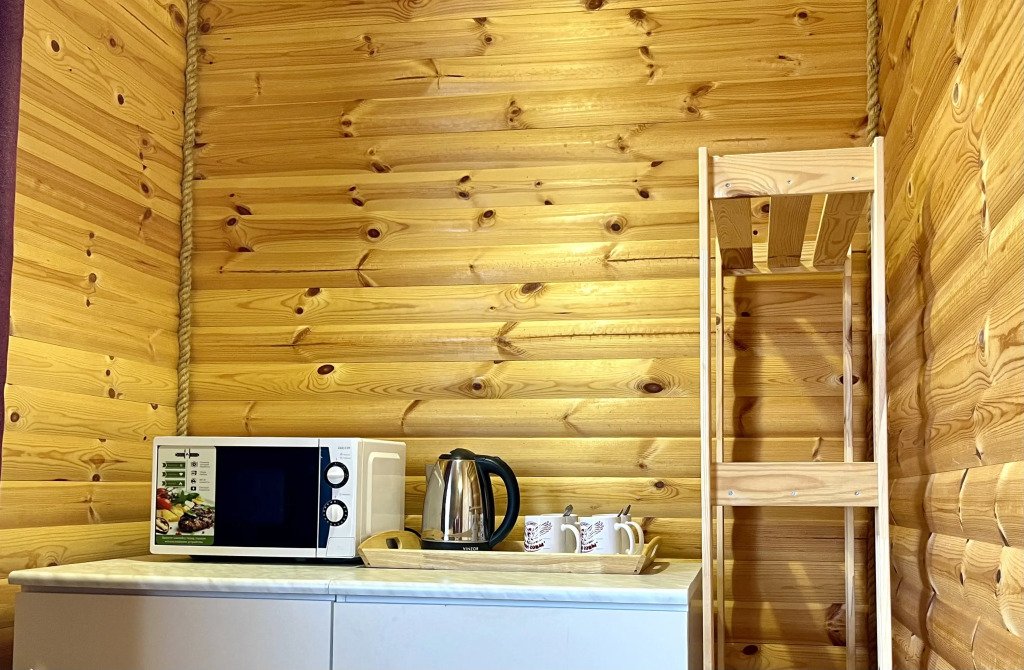 Мини-кухня оборудована холодильником, микроволновкой, электрическим чайником и необходимой посудой.