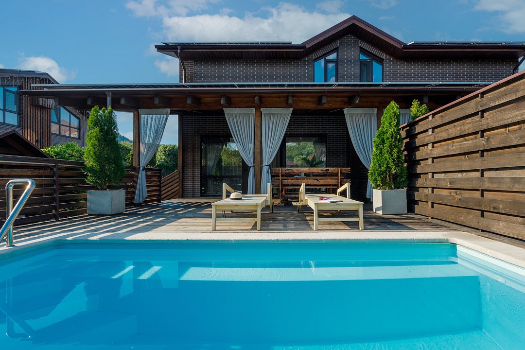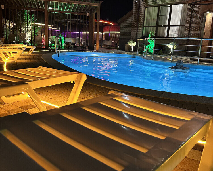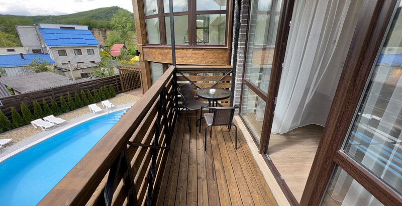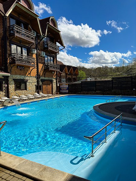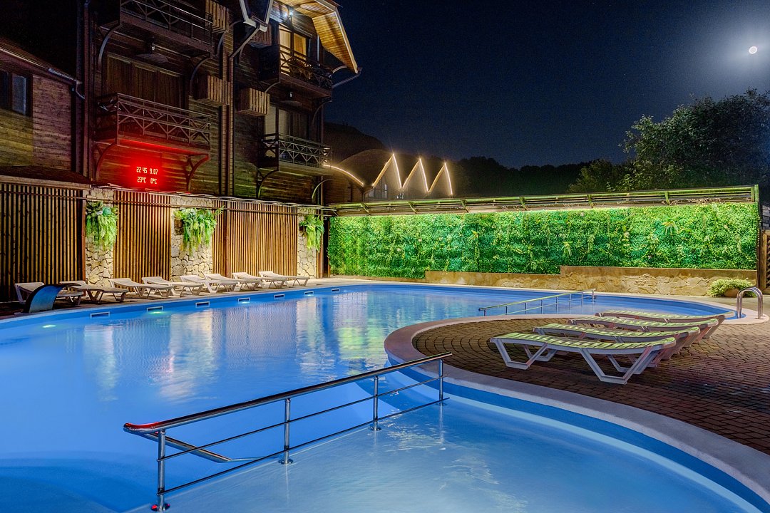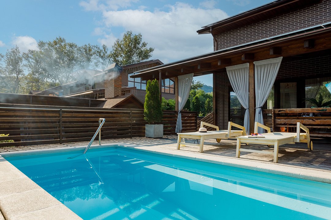 Бассейн с поддержанием идеальной температуры воды позволит вам окунуться в удовольствие от плавания в любое время года. Наслаждайтесь живописным видом на горы Адыгеи и окружающую природу, расслабляясь на шезлонгах рядом с бассейном.