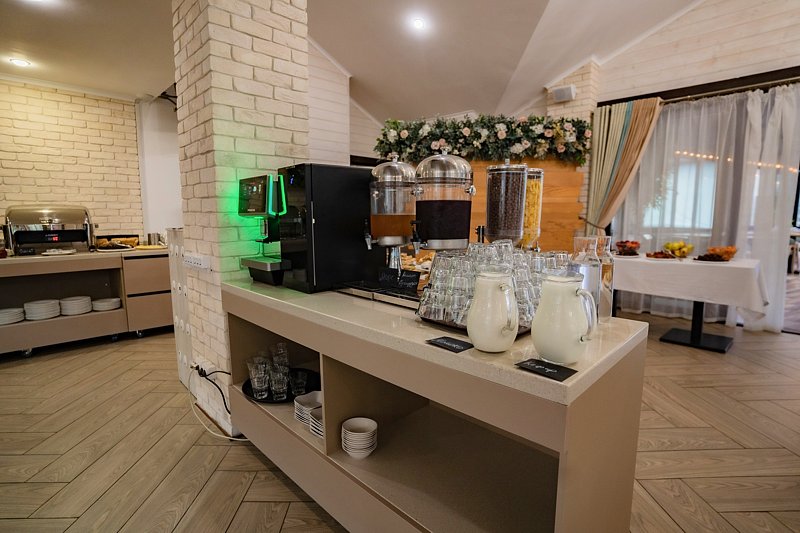 В кафе гостиницы «Терем» гостям предложат блюда местной кухни домашнего приготовления, которые, по желанию гостей, могут подать на террасе. Помимо этого, гости могут воспользоваться принадлежностями для приготовления барбекю.