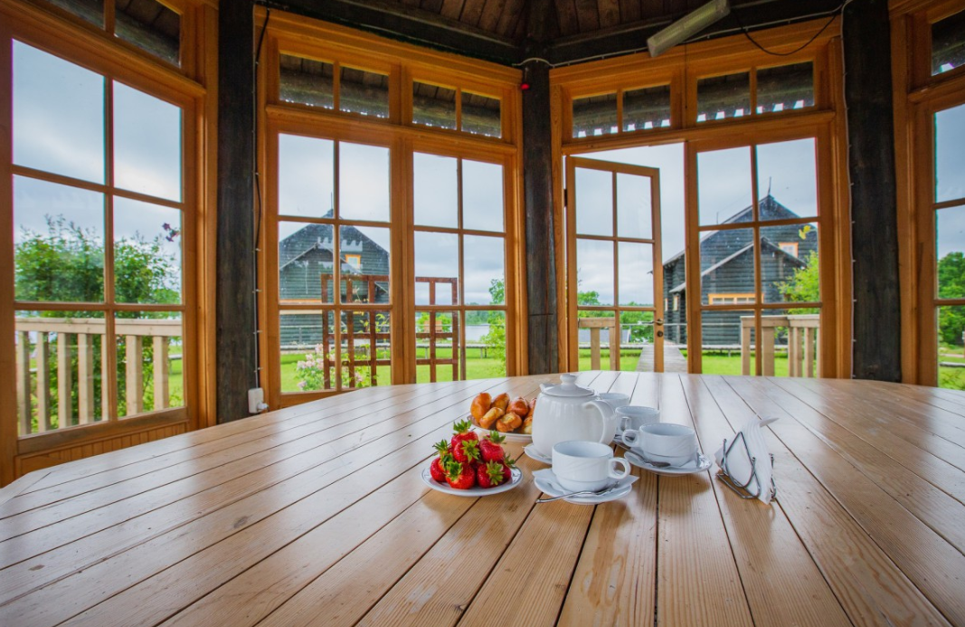 На территории работает уютный ресторан, интерьер которого выдержан в едином стиле со всеми постройками базы. Здесь подаются блюда русской и европейской кухни, продукты для которых приобретаются в местных фермерских хозяйствах. Также гостям доступны: винный погреб, летняя веранда, банкетный зал и бар.