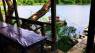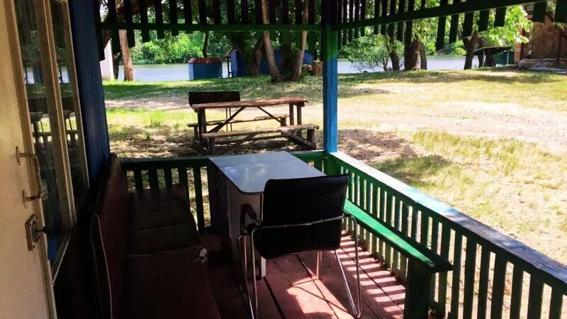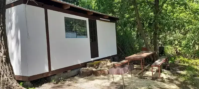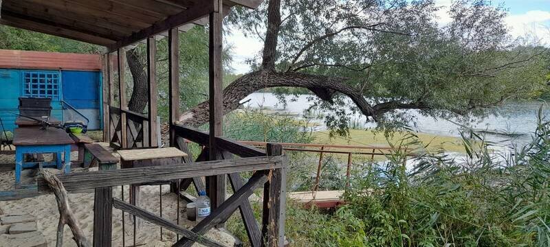 Домик на берегу реки с большим навесом на 20 человек. В домике 4 спальных места и удобства. Находится на самом берегу реки со своим рыбацким местом. Душ, умывальники, туалет, летняя кухня находятся рядом с домиком.