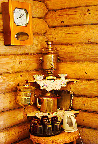 К Вашим услугам все атрибуты настоящей парной: веники дубовые, березовые, с полынью, душистый чай из самовара.