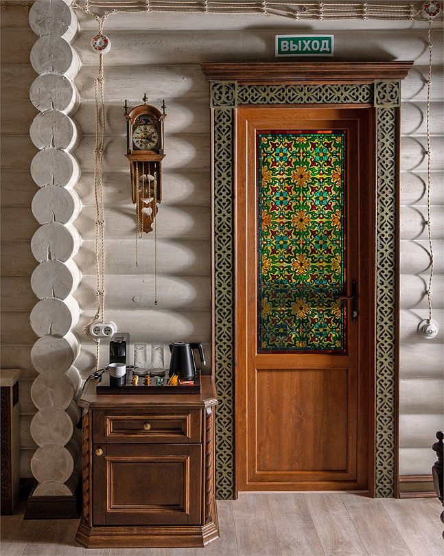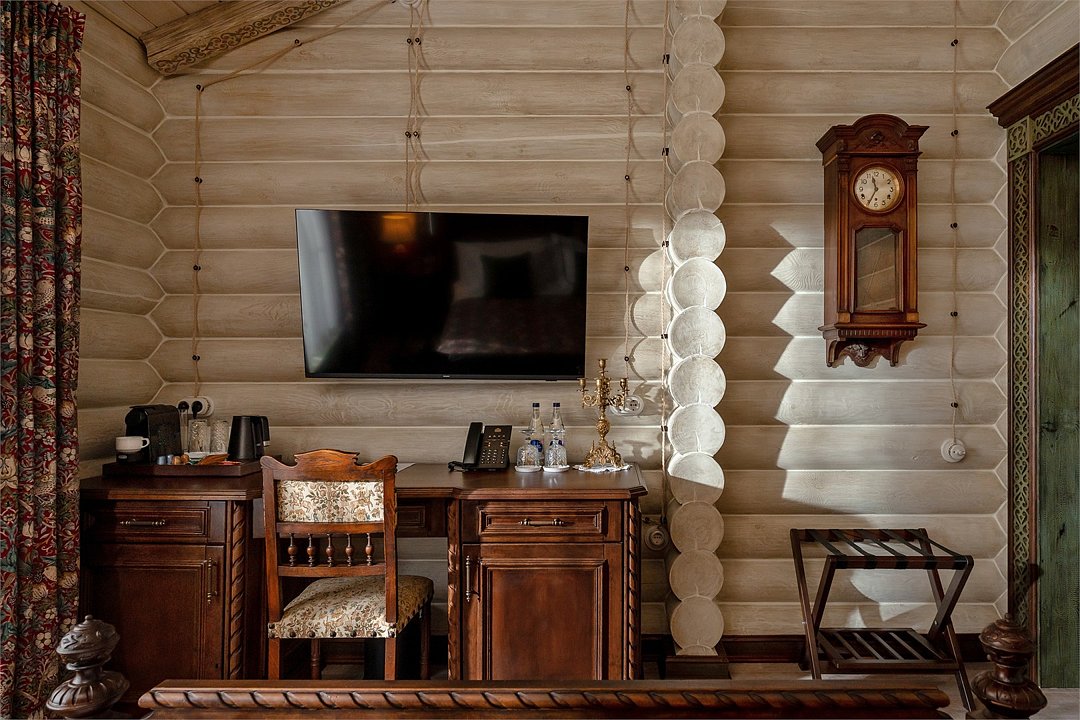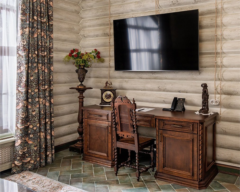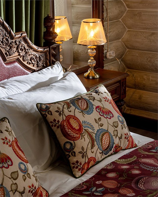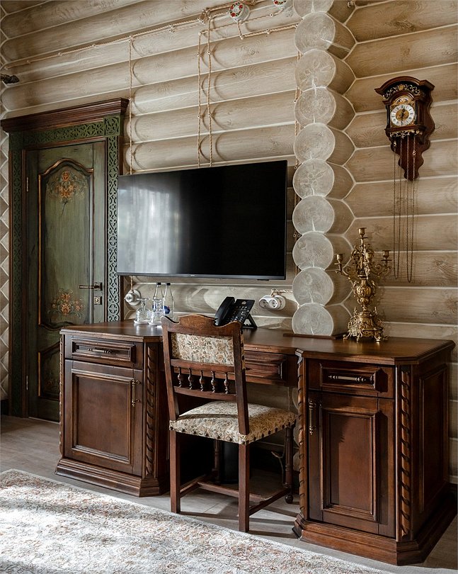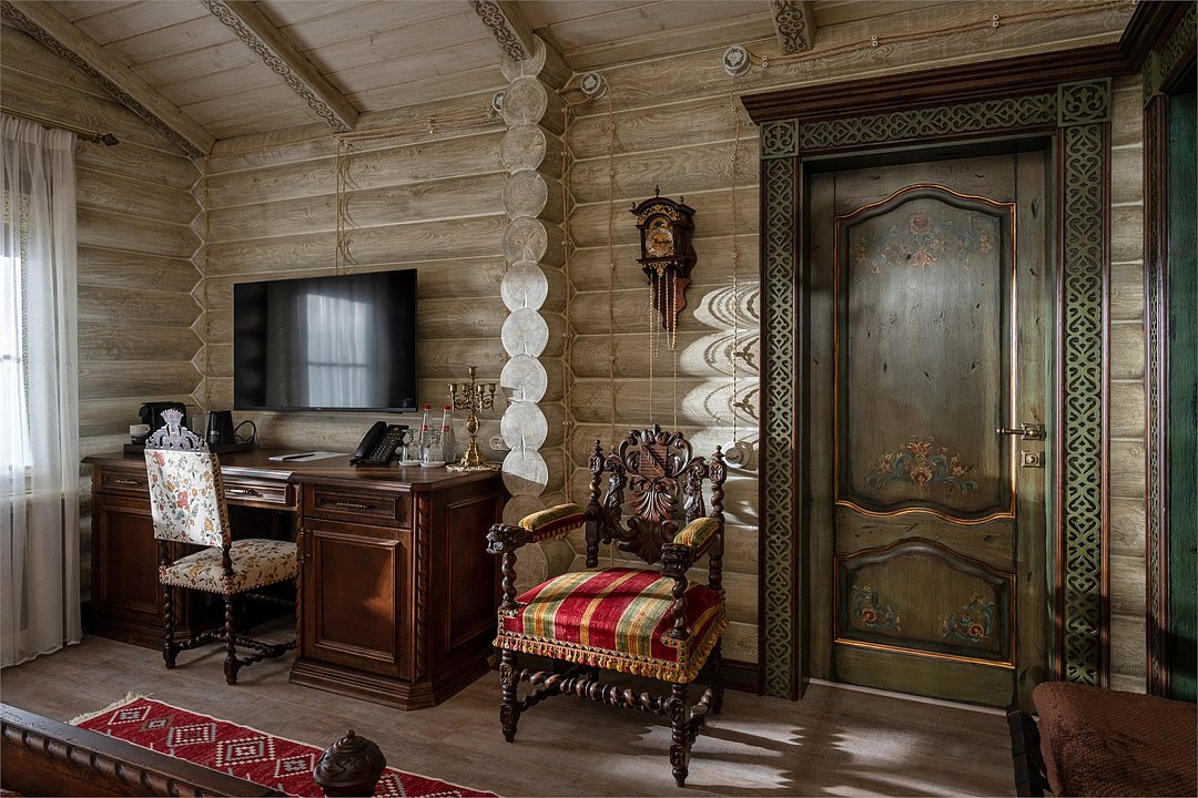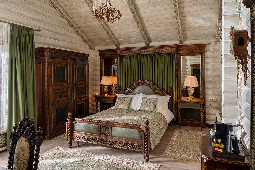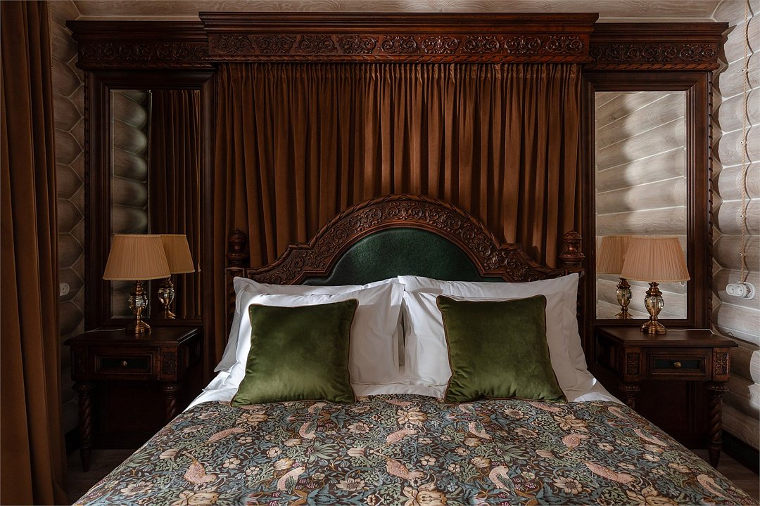 Главный номер парк-отеля «Княжий» — роскошные апартаменты «Царские хоромы», воплощающие идею загородного дворянского дома, где вековые традиции соединяются с современным комфортом. Просторные апартаменты располагаются в отдельном деревянном тереме и поражают вниманием к деталям: мебель из массива с резными элементами, антикварный сервант, гобелены и вазы создают атмосферу старинной усадьбы. В обеденной зоне — круглый стол и кресла ручной работы, за которыми приятно провести ужин или утренний чай. Гостиная оформлена в благородных оттенках зелени и бронзы: бархатный диван, торшер с вышивкой, тяжёлые шторы и ковры с орнаментом придают интерьеру уют и торжественность. В спальне — широкая кровать king size с резным изголовьем и текстилем William Morris. Ванная комната отделана плиткой в духе старинных европейских мануфактур и укомплектована косметикой класса premium LIA LAB. С просторной террасы открывается вид на частный дворик с гидромассажным бассейном под открытым небом — здесь можно расслабиться, слушая тишину парка. Апартаменты рассчитаны на комфортное размещение семьи: двух взрослых и двух гостей на раскладном диване; возможно предоставление дополнительного спального места и детской кроватки. Ребёнок до 6 лет может проживать с родителями без отдельного места. ✨ «Царские хоромы» — это воплощение уюта, достоинства и красоты, где каждая деталь наполнена душой и традицией, а пребывание превращается в путешествие во времени.Услуги и удобства