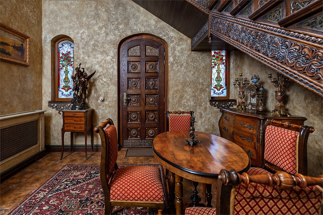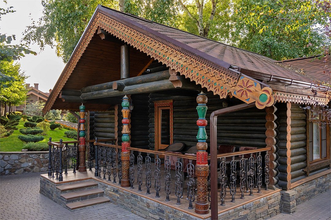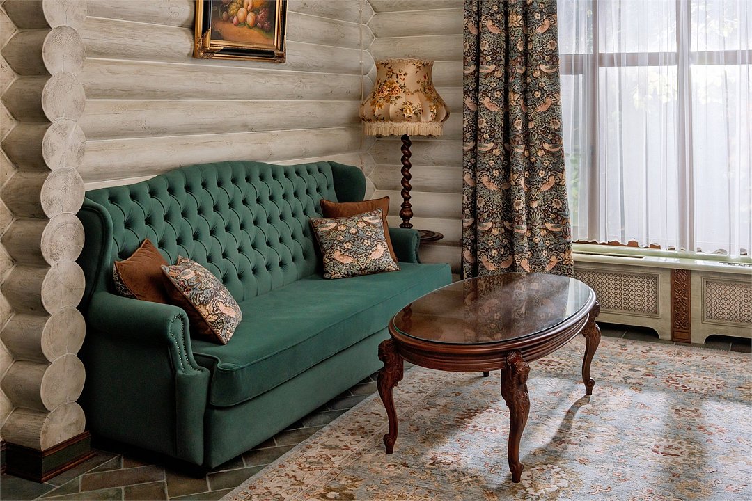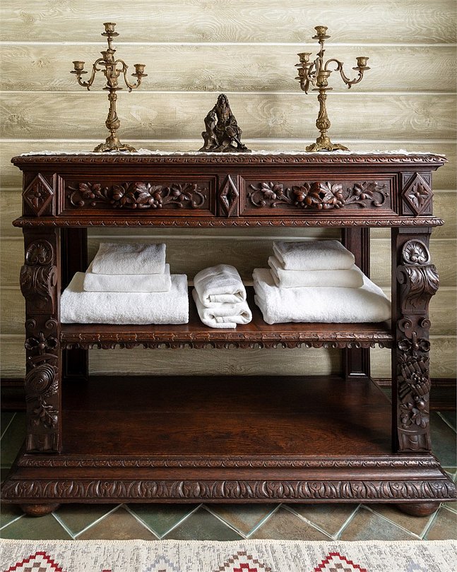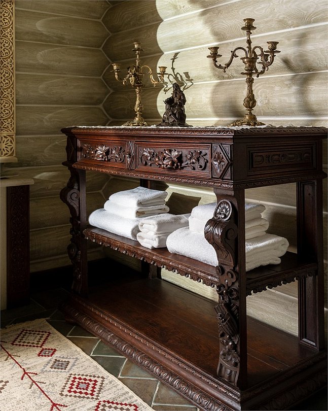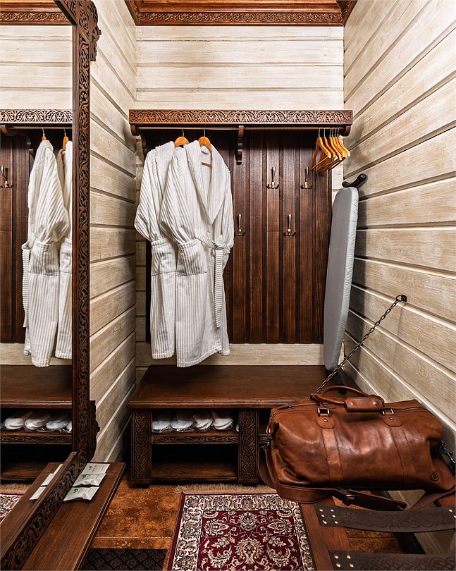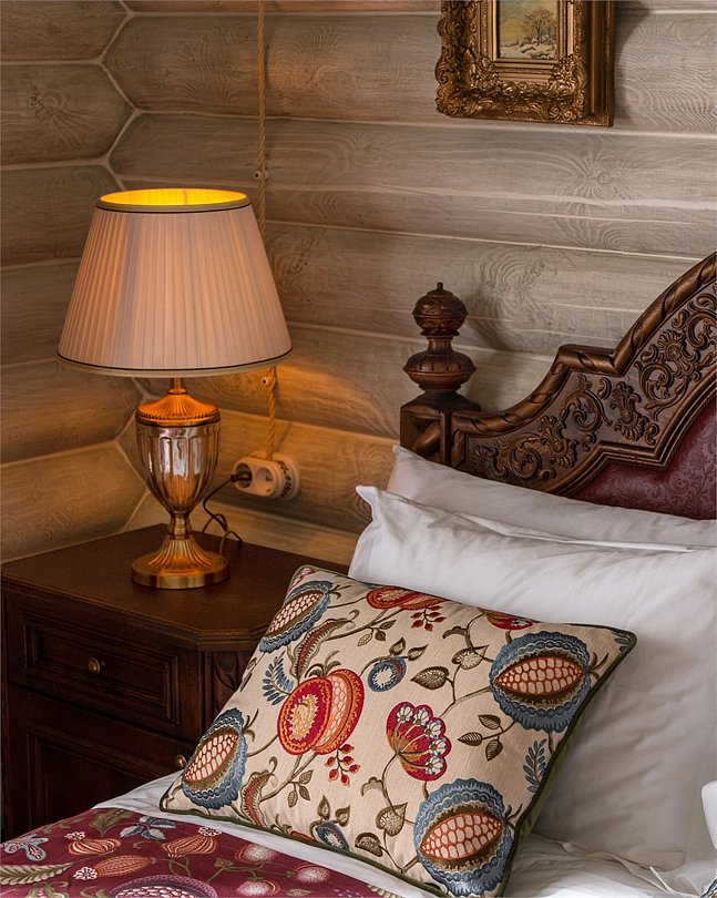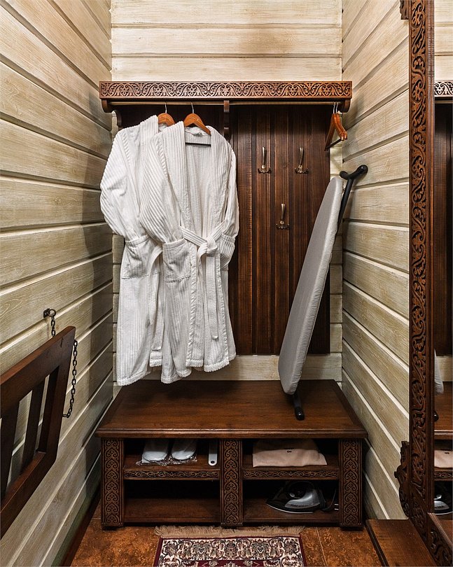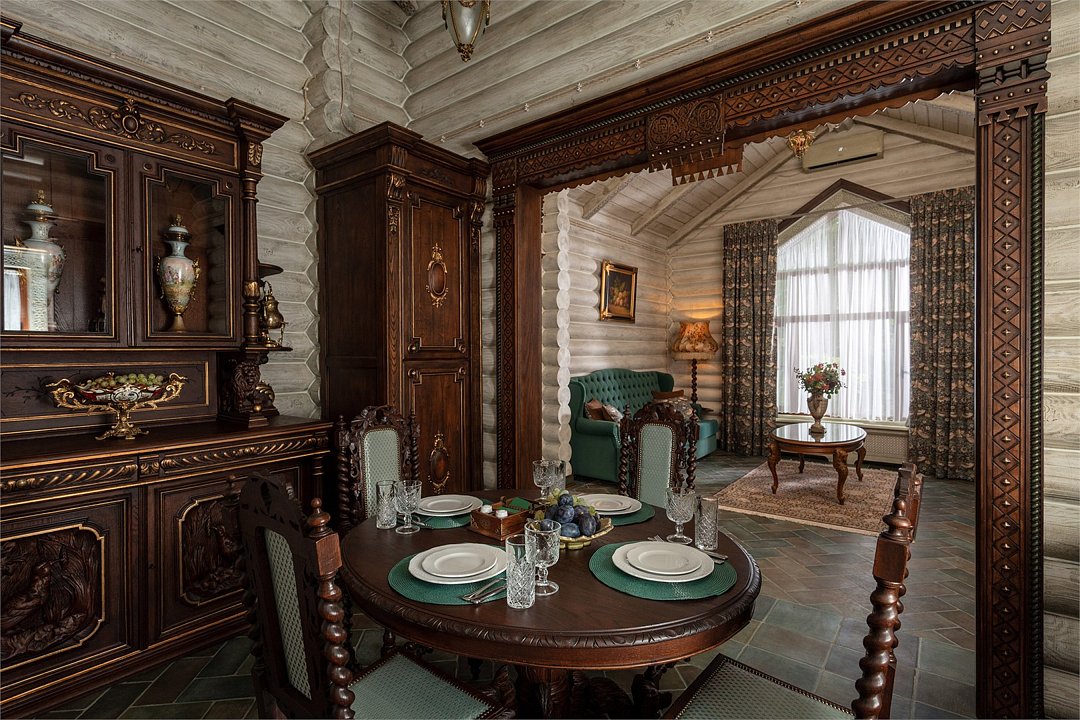 Главный номер парк-отеля «Княжий» — роскошные апартаменты «Царские хоромы», воплощающие идею загородного дворянского дома, где вековые традиции соединяются с современным комфортом. Просторные апартаменты располагаются в отдельном деревянном тереме и поражают вниманием к деталям: мебель из массива с резными элементами, антикварный сервант, гобелены и вазы создают атмосферу старинной усадьбы. В обеденной зоне — круглый стол и кресла ручной работы, за которыми приятно провести ужин или утренний чай. Гостиная оформлена в благородных оттенках зелени и бронзы: бархатный диван, торшер с вышивкой, тяжёлые шторы и ковры с орнаментом придают интерьеру уют и торжественность. В спальне — широкая кровать king size с резным изголовьем и текстилем William Morris. Ванная комната отделана плиткой в духе старинных европейских мануфактур и укомплектована косметикой класса premium LIA LAB. С просторной террасы открывается вид на частный дворик с гидромассажным бассейном под открытым небом — здесь можно расслабиться, слушая тишину парка. Апартаменты рассчитаны на комфортное размещение семьи: двух взрослых и двух гостей на раскладном диване; возможно предоставление дополнительного спального места и детской кроватки. Ребёнок до 6 лет может проживать с родителями без отдельного места. ✨ «Царские хоромы» — это воплощение уюта, достоинства и красоты, где каждая деталь наполнена душой и традицией, а пребывание превращается в путешествие во времени.Услуги и удобства