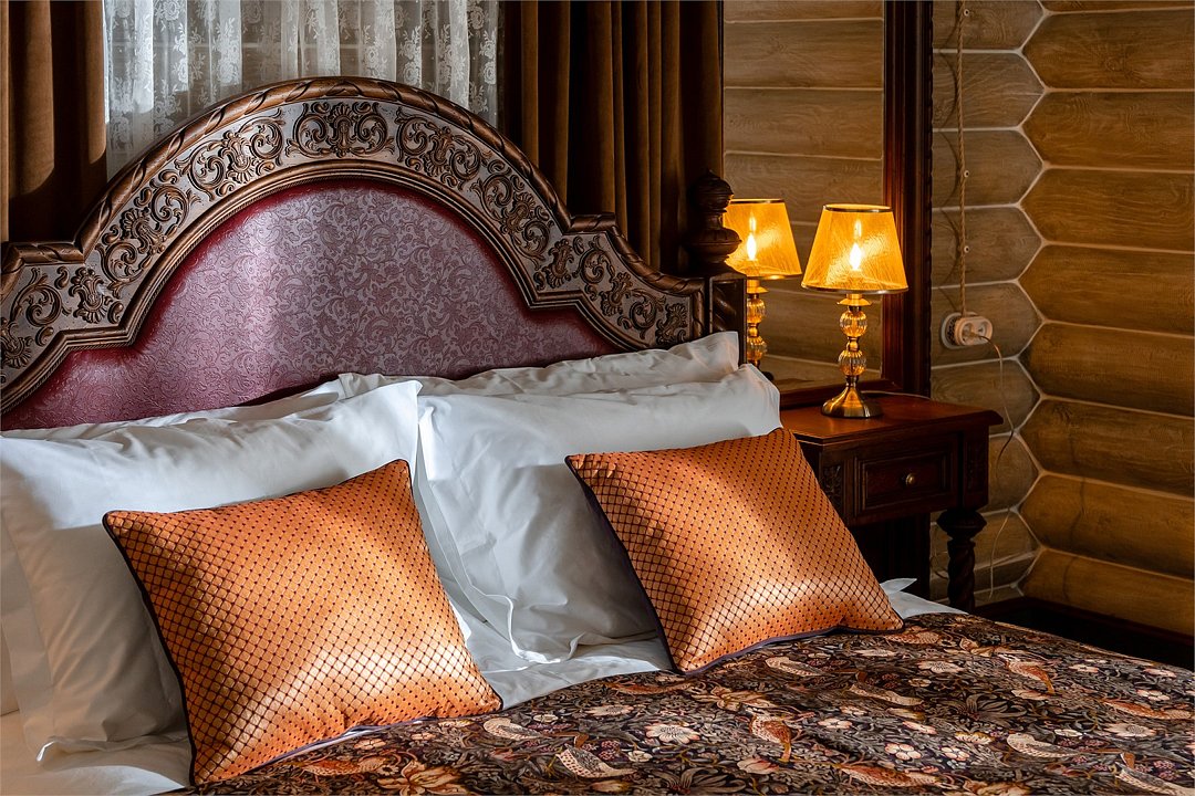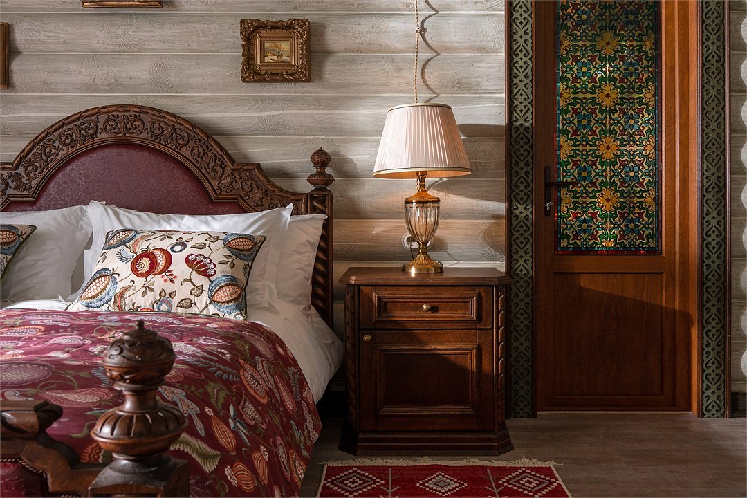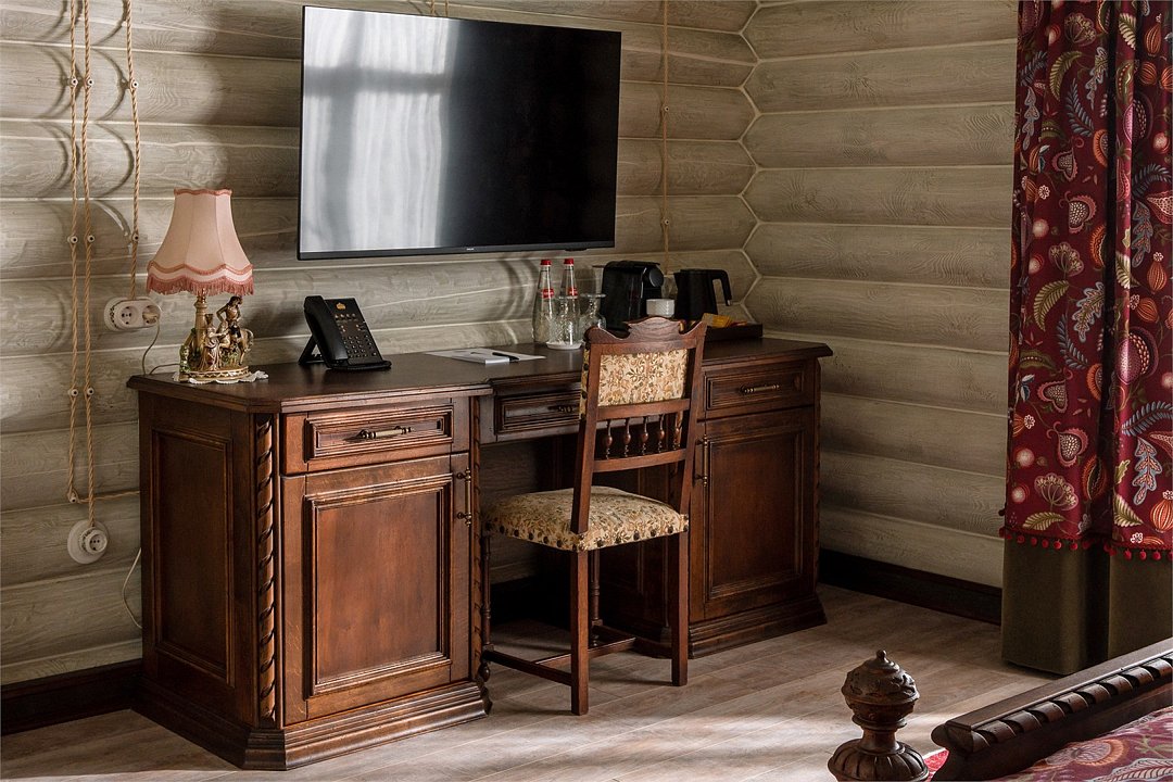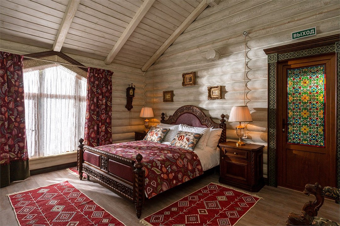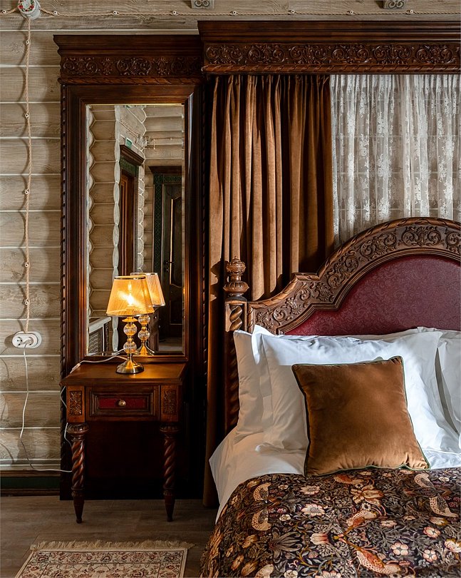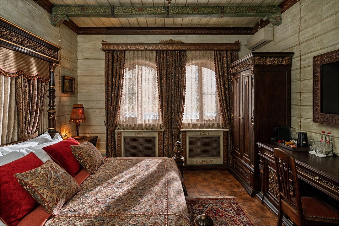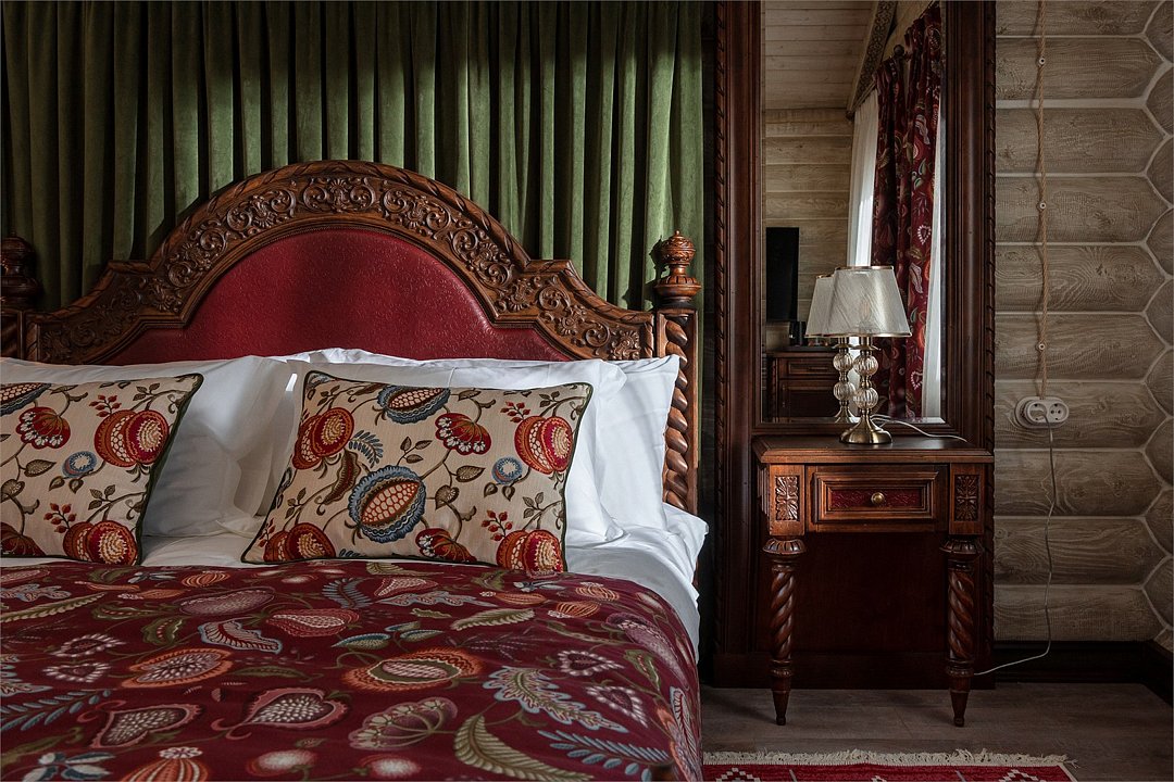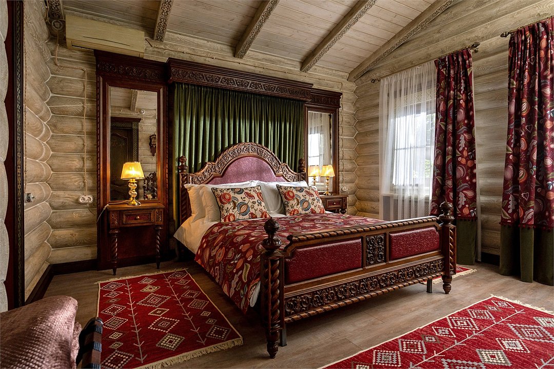 Номер категории Luxe «Царские хоромы» расположен на втором этаже деревянного особняка на территории парка. Дом в духе старинной усадьбы хранит атмосферу уюта и аристократического спокойствия. На первом этаже гостей встречает холл с лестницей из резного дерева, витражами и антикварной мебелью — камерное пространство, где приятно выпить чашку чая или насладиться тишиной. Интерьер номера выполнен в русском стиле: расписанные мастерами парка двери и шкафы, антикварный сервант с фарфором и хрусталём, мягкий свет ламп создают ощущение тепла и благородства. Спальня оформлена в тёплых оттенках бордо и охры, дополнена орнаментальным текстилем и декоративными подушками. В мансардной детской — две расписные кровати, наполненные атмосферой сказочного уюта. Ванная комната оформлена пастельной плиткой и зеркалом в фигурной раме — каждое утро здесь начинается красиво. ✨ «Царские хоромы» — это пространство, где каждая деталь наполнена душой и традицией, а пребывание превращается в маленькое путешествие во времени.Услуги и удобства