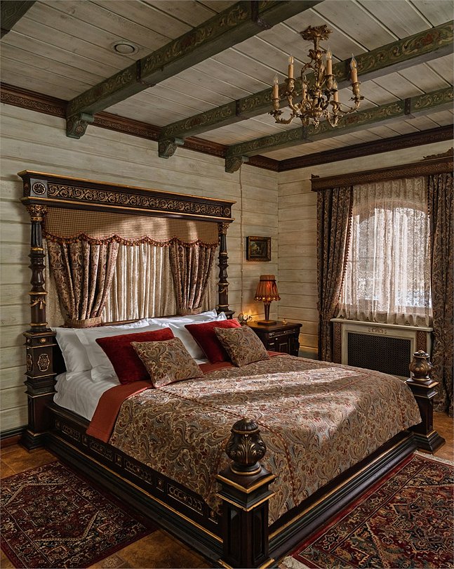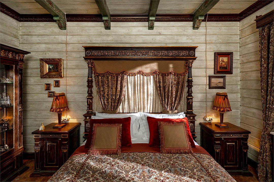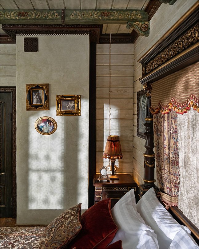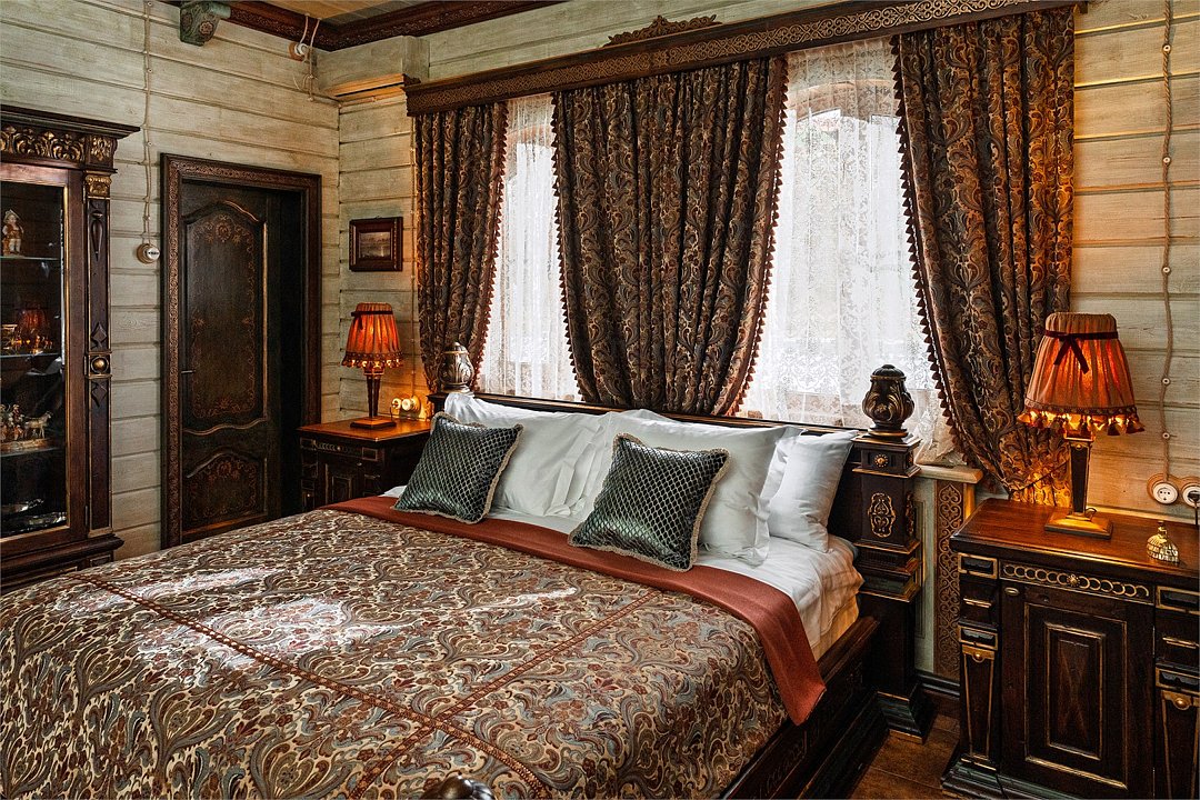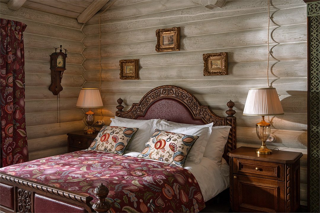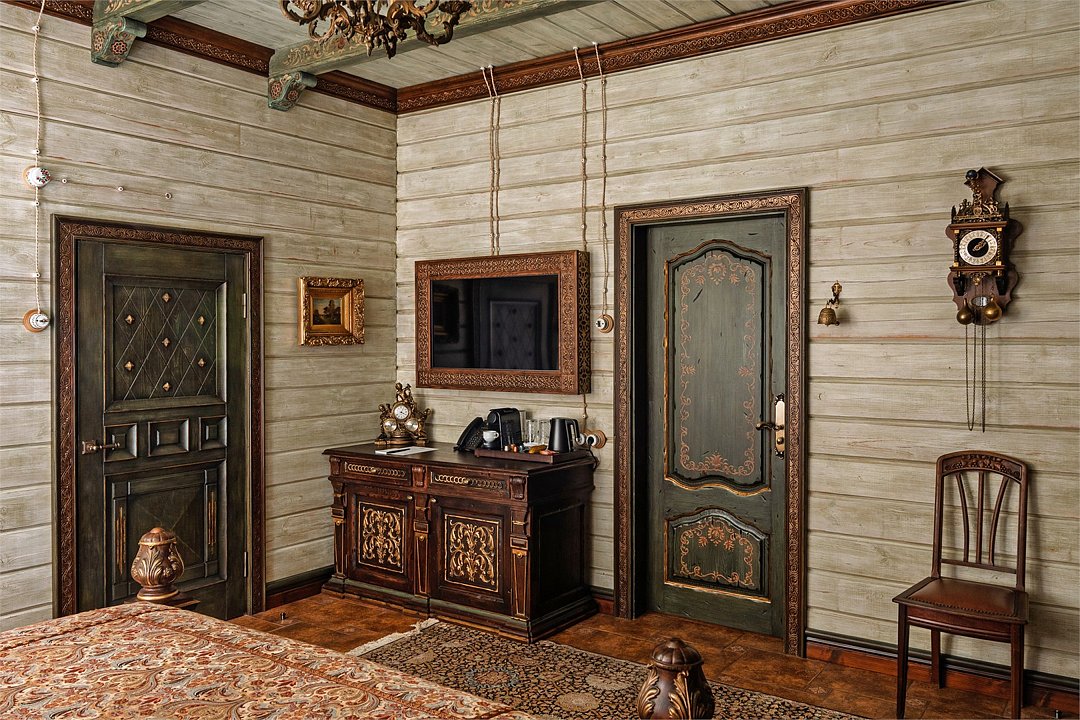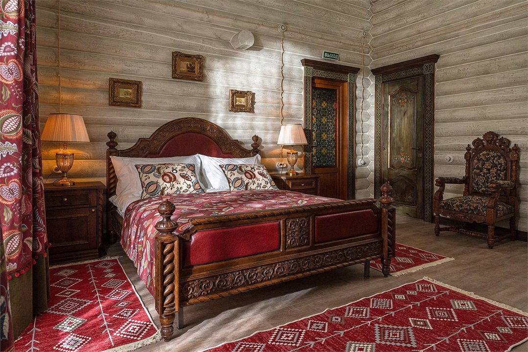 Номер категории Luxe «Царские хоромы» расположен на втором этаже деревянного особняка на территории парка. Дом в духе старинной усадьбы хранит атмосферу уюта и аристократического спокойствия. На первом этаже гостей встречает холл с лестницей из резного дерева, витражами и антикварной мебелью — камерное пространство, где приятно выпить чашку чая или насладиться тишиной. Интерьер номера выполнен в русском стиле: расписанные мастерами парка двери и шкафы, антикварный сервант с фарфором и хрусталём, мягкий свет ламп создают ощущение тепла и благородства. Спальня оформлена в тёплых оттенках бордо и охры, дополнена орнаментальным текстилем и декоративными подушками. В мансардной детской — две расписные кровати, наполненные атмосферой сказочного уюта. Ванная комната оформлена пастельной плиткой и зеркалом в фигурной раме — каждое утро здесь начинается красиво. ✨ «Царские хоромы» — это пространство, где каждая деталь наполнена душой и традицией, а пребывание превращается в маленькое путешествие во времени.Услуги и удобства