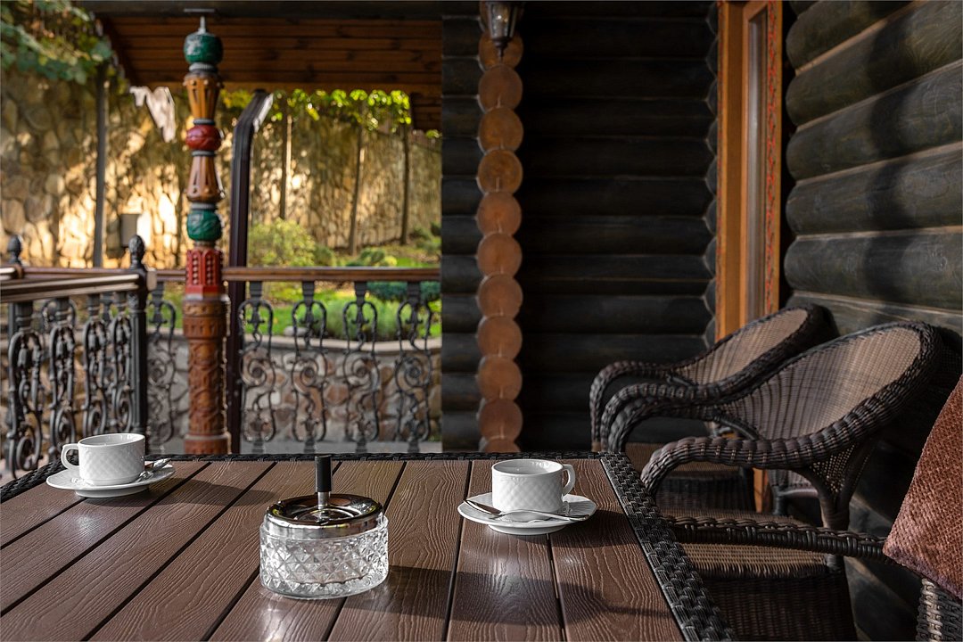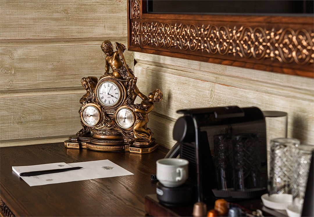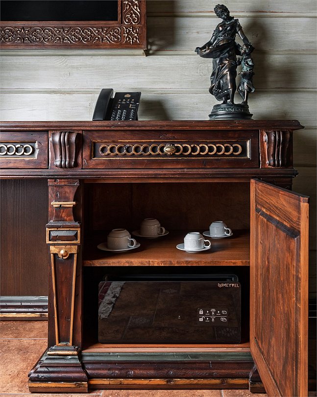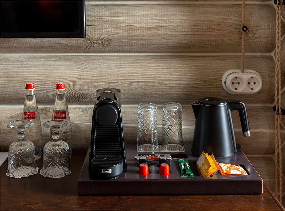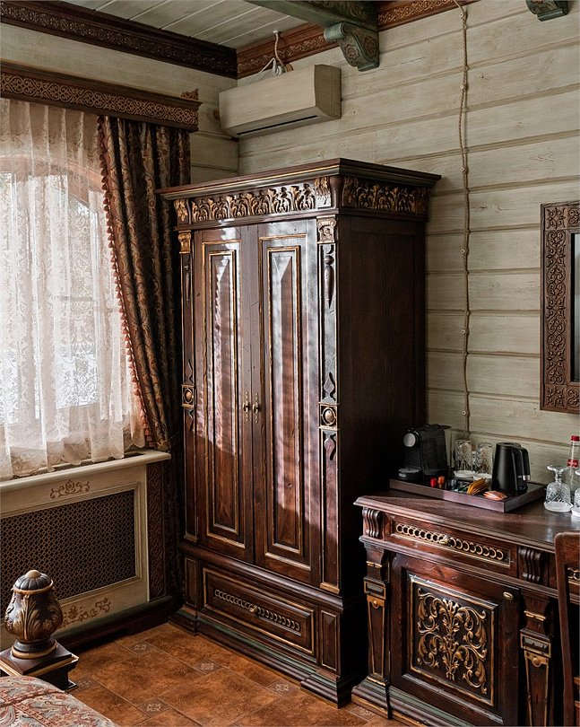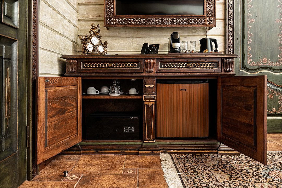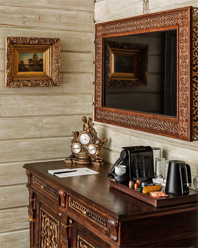 «Княжий терем» Luxe — однокомнатный номер класса Junior Suite, расположенный в отдельном деревянном тереме. Интерьер выдержан в стиле старинной усадьбы: антикварные предметы, мебель ручной работы, деревянные стены и текстиль William Morris создают атмосферу уюта и безмятежности. Воздух наполняет фирменный аромат отеля — тонкое сочетание свежести дерева и травяных нот. В спальне установлена широкая кровать Queen size с ортопедическим матрасом. По запросу возможно размещение до двух детских кроваток, а также проживание ребёнка до 6 лет совместно с родителями без отдельного места. Номер оснащён телевизором, кофемашиной, мини-баром, рабочей зоной и просторной террасой с плетёной мебелью и качелями — идеальным местом для утреннего кофе или вечернего отдыха. ✨ «Княжий терем» Luxe — выбор тех, кто ценит эстетику ручной работы, комфорт и атмосферу старинного дома, где каждая деталь продумана до совершенства.Услуги и удобства