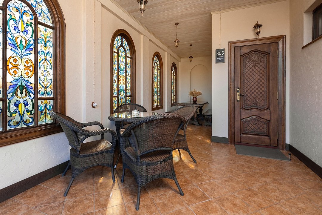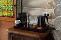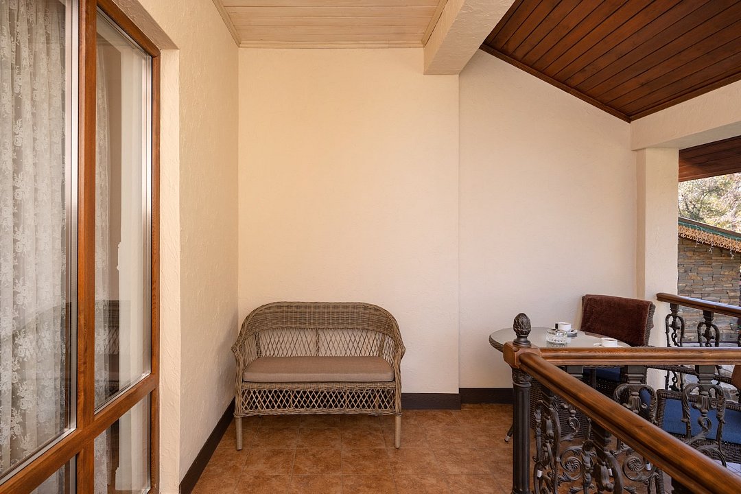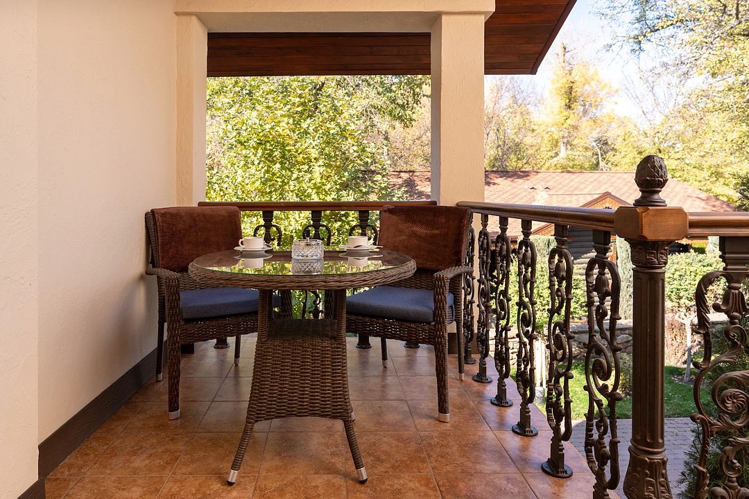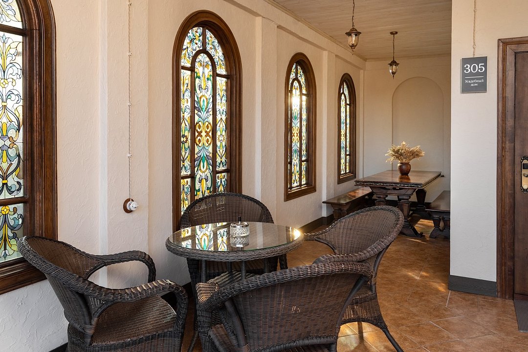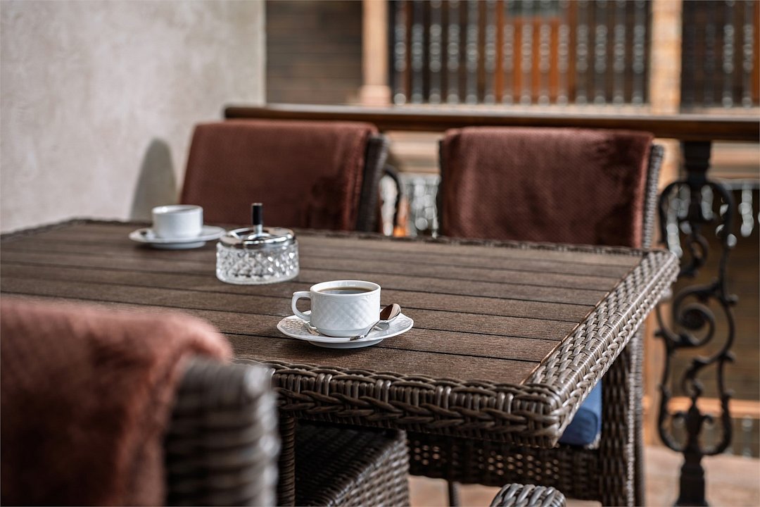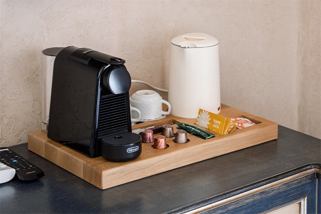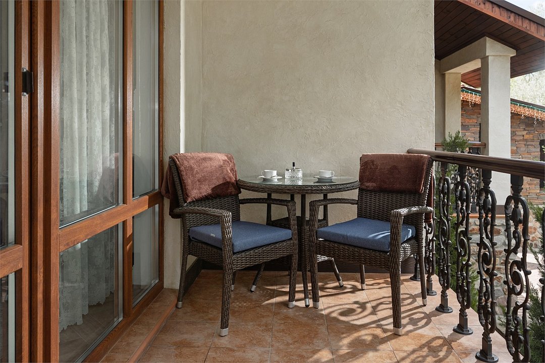 «Княжий терем» Luxe — однокомнатный номер класса Junior Suite, расположенный в отдельном деревянном тереме. Интерьер выдержан в стиле старинной усадьбы: антикварные предметы, мебель ручной работы, деревянные стены и текстиль William Morris создают атмосферу уюта и безмятежности. Воздух наполняет фирменный аромат отеля — тонкое сочетание свежести дерева и травяных нот. В спальне установлена широкая кровать Queen size с ортопедическим матрасом. По запросу возможно размещение до двух детских кроваток, а также проживание ребёнка до 6 лет совместно с родителями без отдельного места. Номер оснащён телевизором, кофемашиной, мини-баром, рабочей зоной и просторной террасой с плетёной мебелью и качелями — идеальным местом для утреннего кофе или вечернего отдыха. ✨ «Княжий терем» Luxe — выбор тех, кто ценит эстетику ручной работы, комфорт и атмосферу старинного дома, где каждая деталь продумана до совершенства.Услуги и удобства