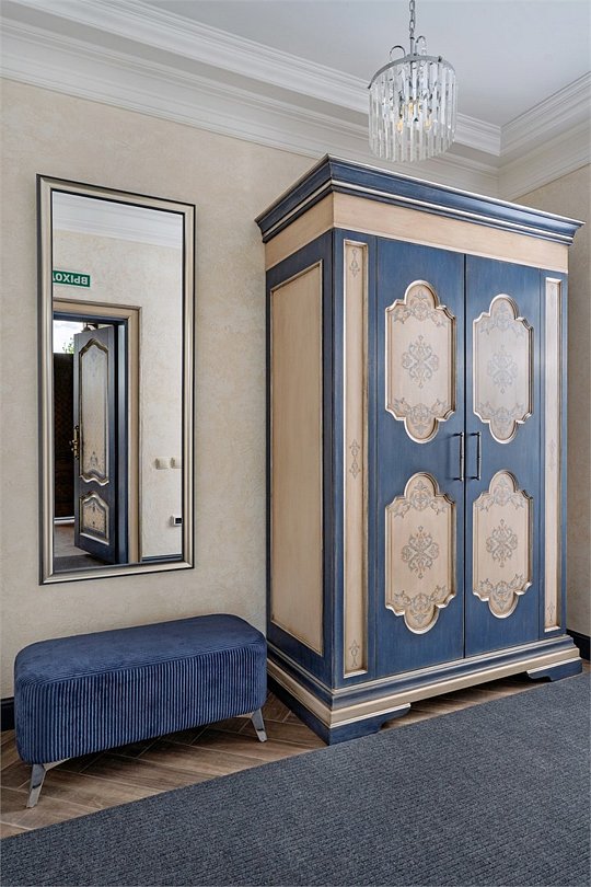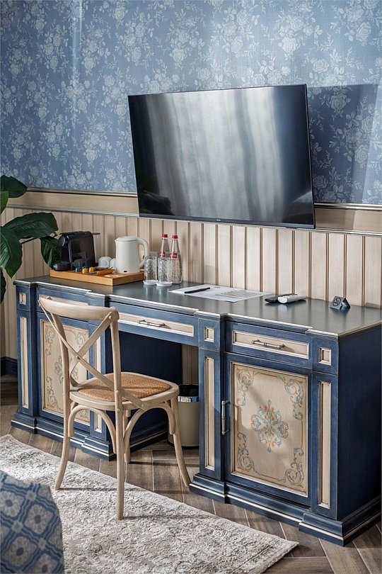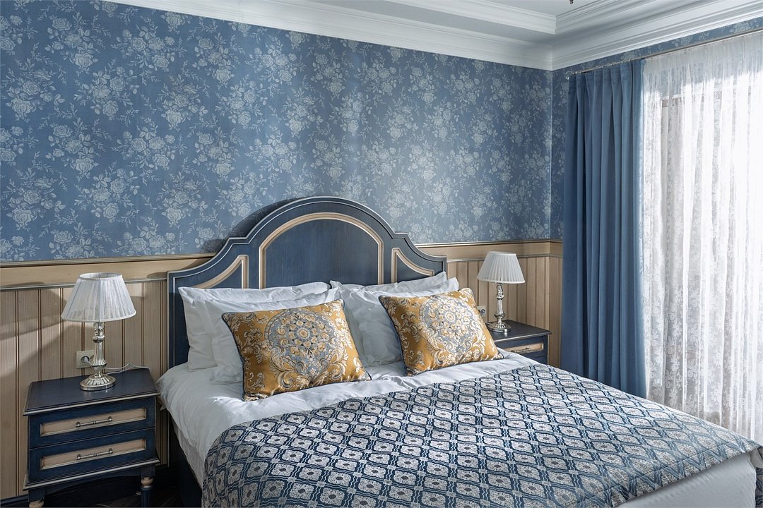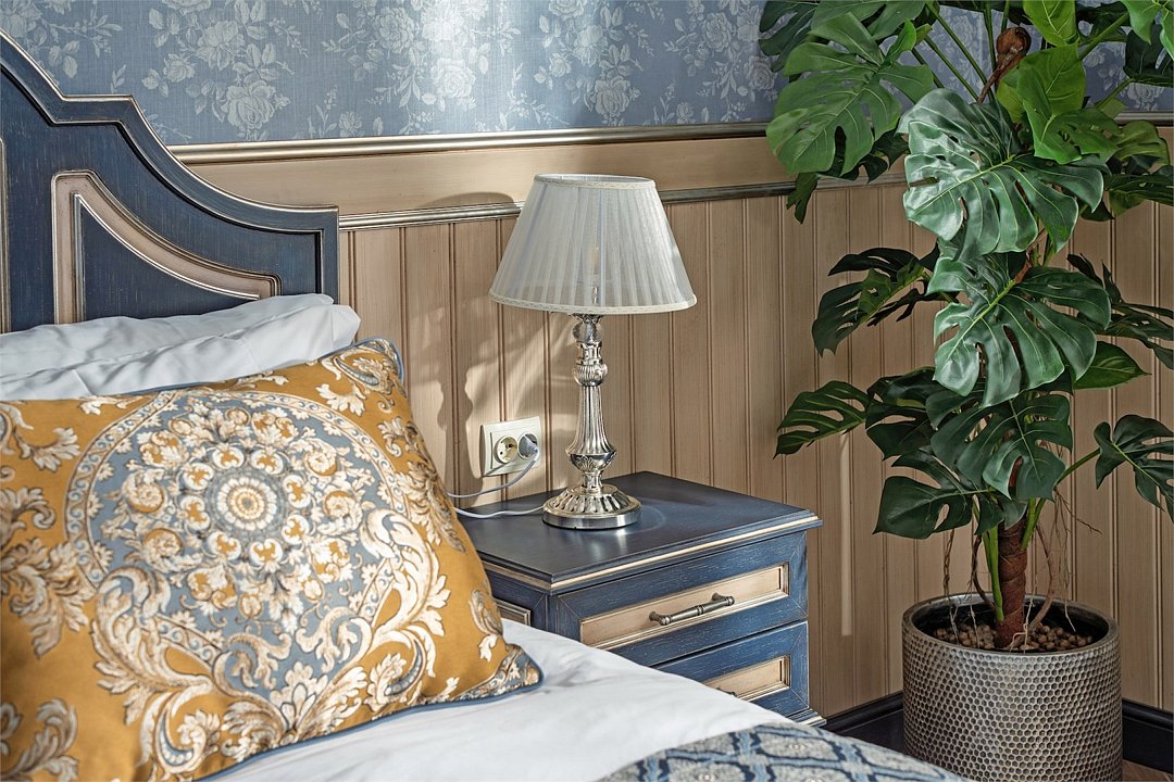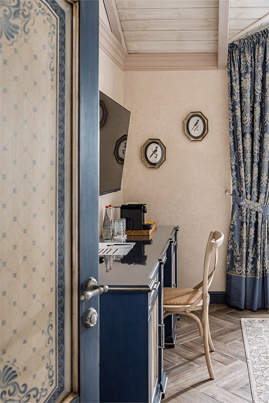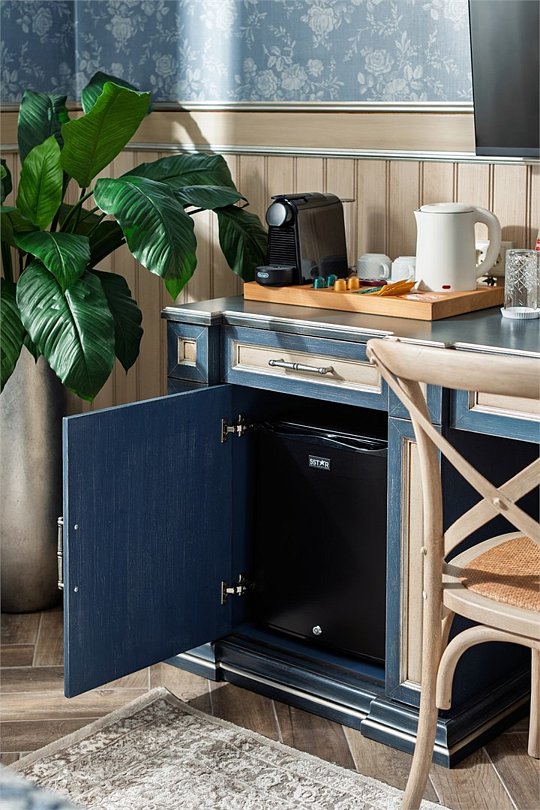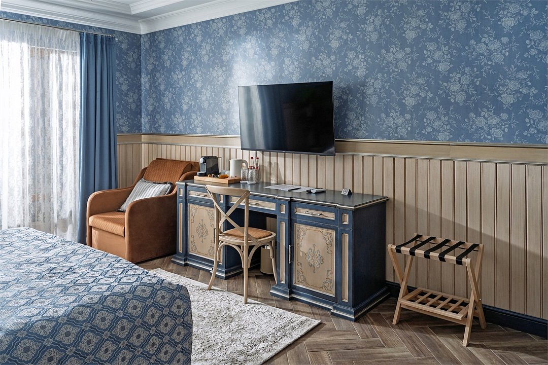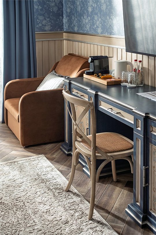 Номер категории «Усадебный дом» Comfort — это светлое пространство площадью 27 кв. м, где исторический шарм гармонично сочетается с современным комфортом. Интерьер выдержан в мягкой палитре с голубыми акцентами: стены украшены английскими обоями, воссозданными по историческим образцам, а двери и мебель ручной работы мастеров парка расписаны во флорентийской технике. В ванной комнате — делфтская плитка, напоминающая русскую гжель и создающая атмосферу старинного усадебного дома. Номер идеально подойдёт для пары, а для семейного отдыха предусмотрена возможность установки до двух детских кроваток для малышей до 7 лет. Он располагается в большом Усадебном доме и имеет собственный балкон с плетёной мебелью, а также доступ к общей просторной террасе, где можно устроить семейный обед или провести время в компании друзей. Соседство с номером категории «Джуниор сюит» делает его особенно удобным для отдыха несколькими поколениями семьи или небольшой компании. Это решение для тех, кто ценит уют, изысканные детали интерьера и спокойствие загородного отдыха.Услуги и удобства