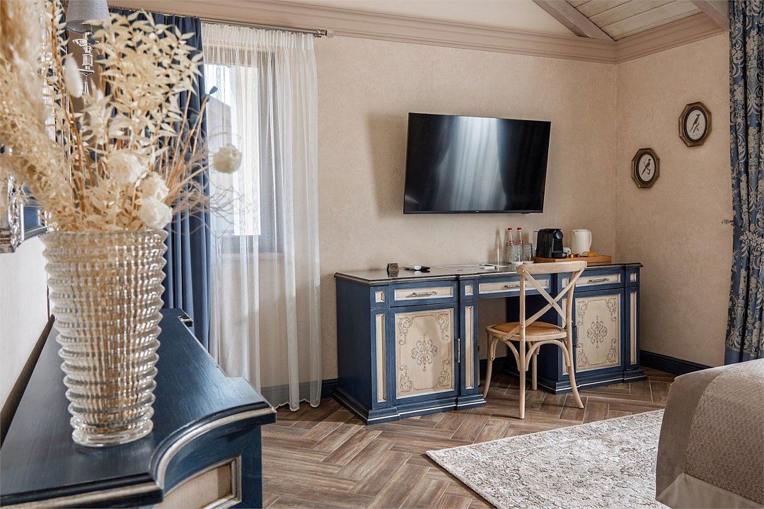 Номер категории Luxe «Усадебный дом» — самый просторный из усадебных номеров, расположенный в отдельном коттедже на верхней террасе парк-отеля. Интерьер сочетает свет, изящество и традиции русского усадебного стиля. Мягкая палитра — белый, бежевый и оттенки голубого — наполняет пространство лёгкостью и гармонией, а мебель и двери, выполненные мастерами парка вручную и расписанные во флорентийской технике, придают номеру неповторимый шарм. В спальне установлена кровать king size с ортопедическим матрасом, а для подростка предусмотрено дополнительное раскладное кресло. Ванная комната оформлена бело-голубой делфтской плиткой, напоминающей гжель и создающей атмосферу старинного усадебного дома. Номер располагает просторным балконом с плетёной мебелью и общей террасой с соседним номером — это идеальное пространство для отдыха на свежем воздухе, где утренний кофе превращается в маленький ритуал. ✨ «Усадебный дом» Luxe подойдёт для пары или семьи, которая ценит комфорт, свет и эстетику русской классики в современном исполнении.Услуги и удобства