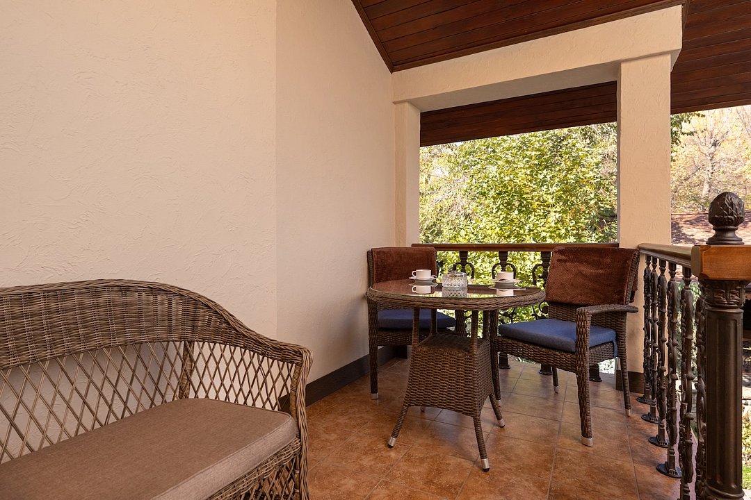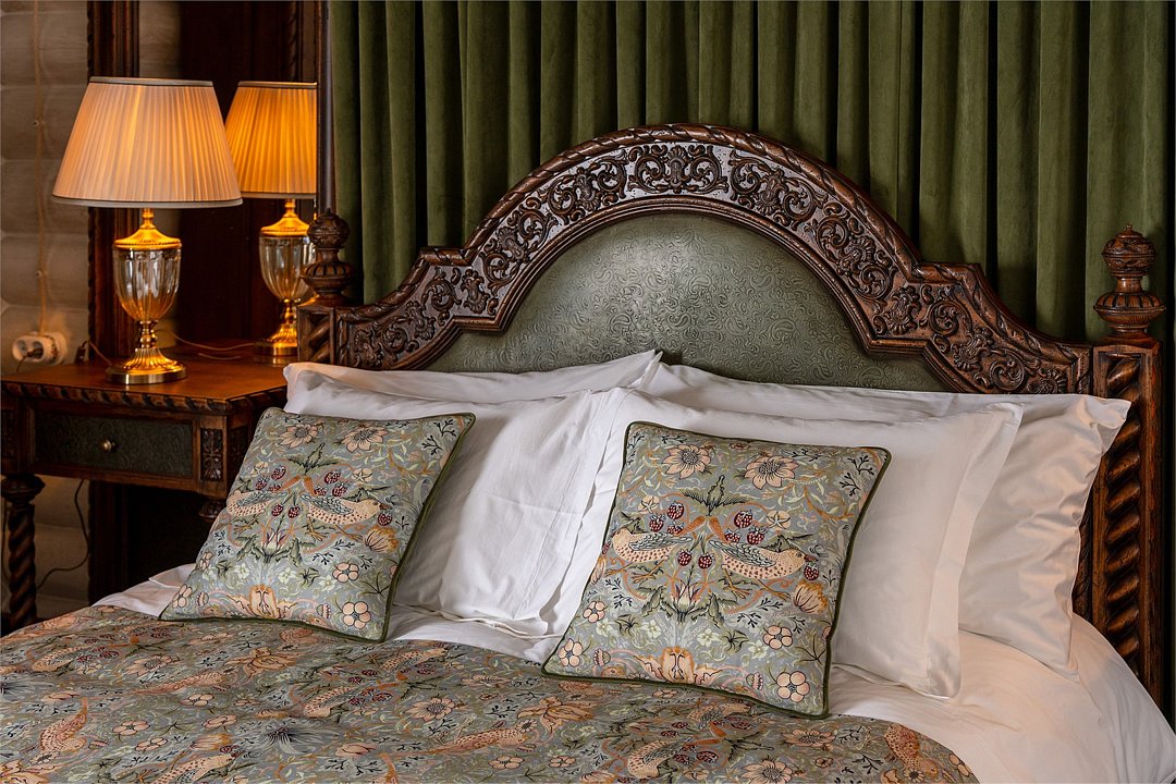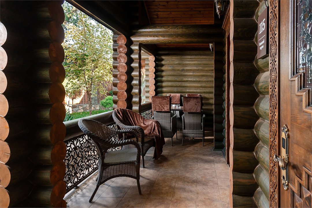 «Княжий терем» Luxe — однокомнатный номер класса Junior Suite в отдельном деревянном тереме, окружённом зеленью парка. Интерьер сочетает благородные тона, антикварные детали и текстиль William Morris, создавая атмосферу аристократического уюта. В спальне установлена кровать queen size, по запросу возможно размещение дополнительного спального места и детских кроваток. Просторная терраса с плетёной мебелью станет идеальным местом для отдыха на свежем воздухе. ✨ «Княжий терем» Luxe — выбор гостей, которые ценят уединение, эстетику ручной работы и атмосферу гармонии с природой.Услуги и удобства