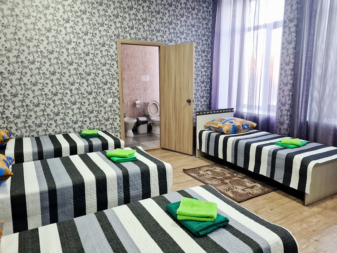 Трёхместный номер «Комфорт» с двуспальной и односпальной кроватями — удобный вариант размещения для семьи или небольшой компании из трёх человек. В номере одна двуспальная и одна односпальная кровать, телевизор, шкаф для одежды, прикроватные тумбочки, бесплатный Wi‑Fi, гостям предоставляются постельное бельё и полотенца. В собственной ванной комнате есть санузел и душевая, а также базовые туалетные принадлежности, что обеспечивает дополнительный комфорт по сравнению с номерами с общими удобствами.