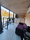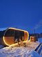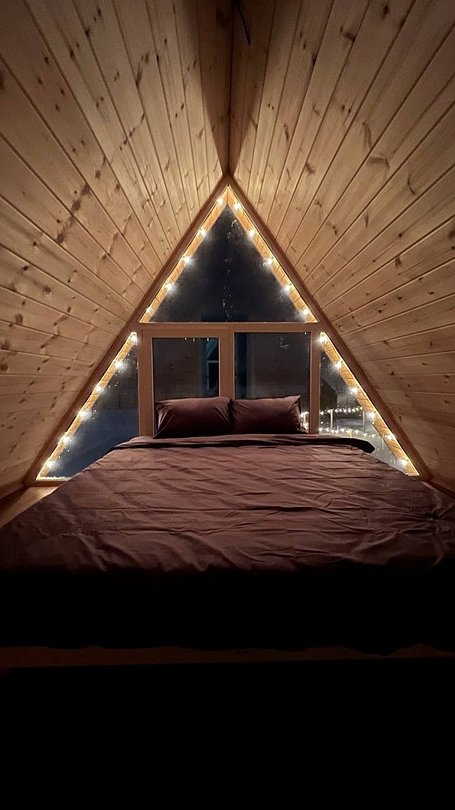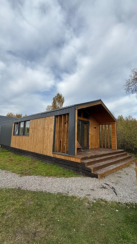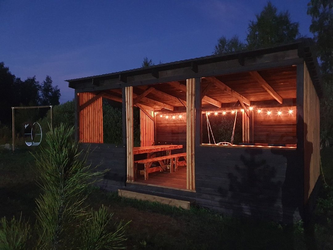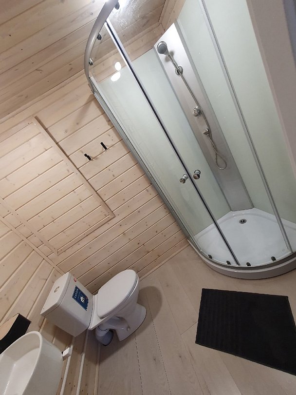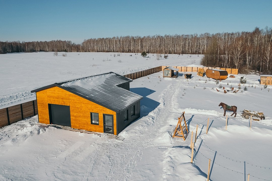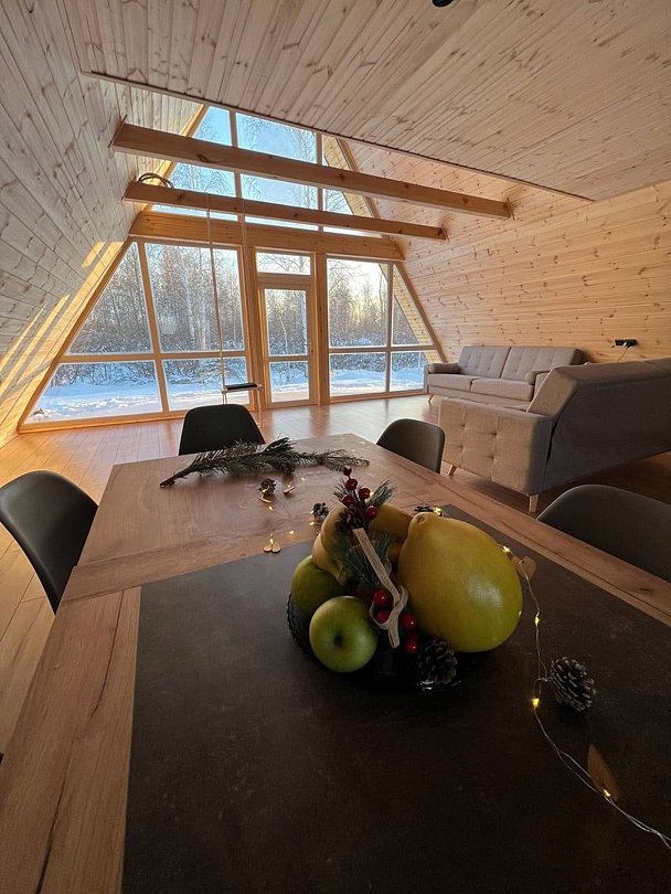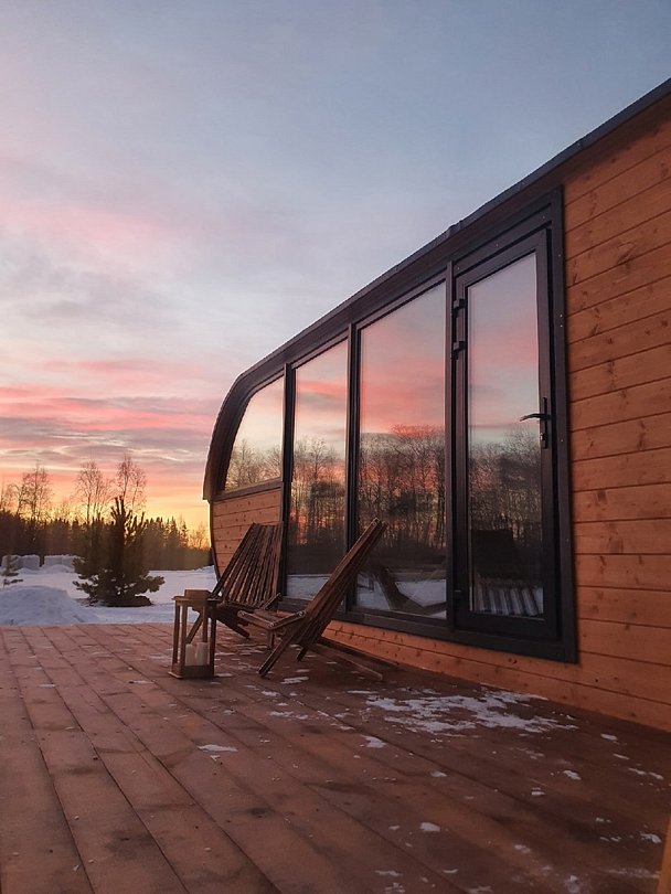 Домик с панорамными окнами на 4-х человек с двумя комнатами: спальная и гостиная с раскладным диванчиком, так же в домике имеется теплый пол, душ, туалет, холодильник, эл. плита, эл. чайник, посуда, мангальная зона. Рядом с домиком находится банный чан и сад.