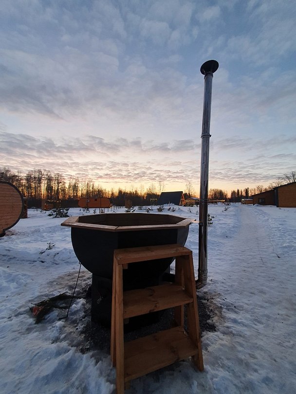 Фурако под открытым небом, выполненная полностью из древесины,. заполненная водой, затопленная дровами и запаренная веточками пихты, по предварительной записи вы можете добавить украшение лепестками роз или цитрусовыми.