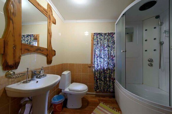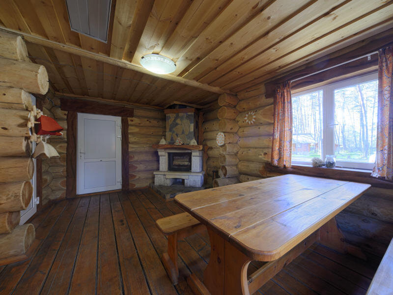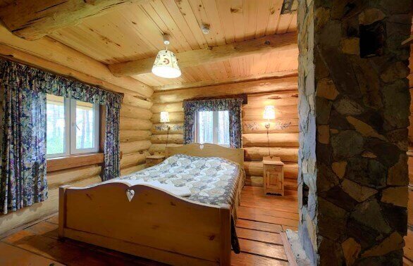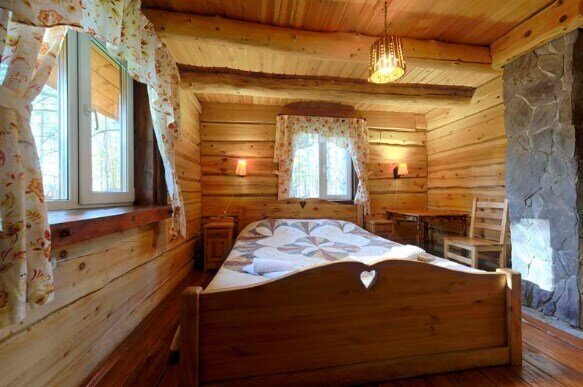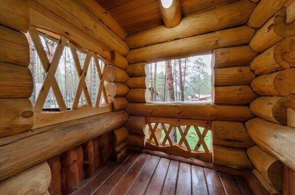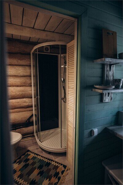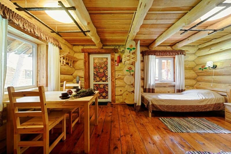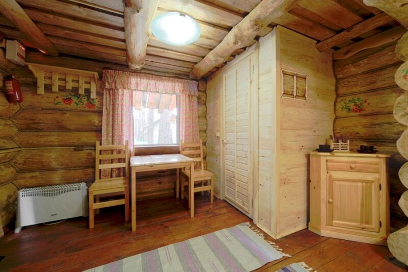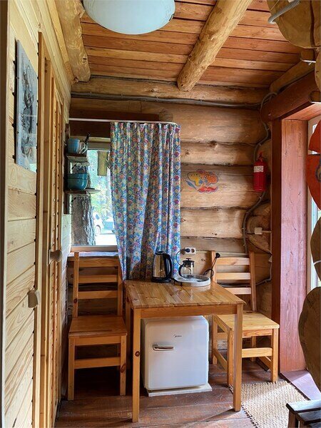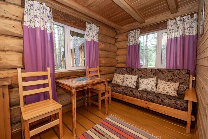 Просторный уютный деревенский домик, построенный из гигантских кедровых бревен включает в себя: спальную зону с двумя кроватями и прикроватные тумбочки; обеденную зону с удобным обеденным столом со стульями, посудой и чайником; прихожую с тумбой для обуви и вешалкой для одежды; санузел с туалетом и душевой кабиной.