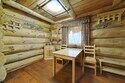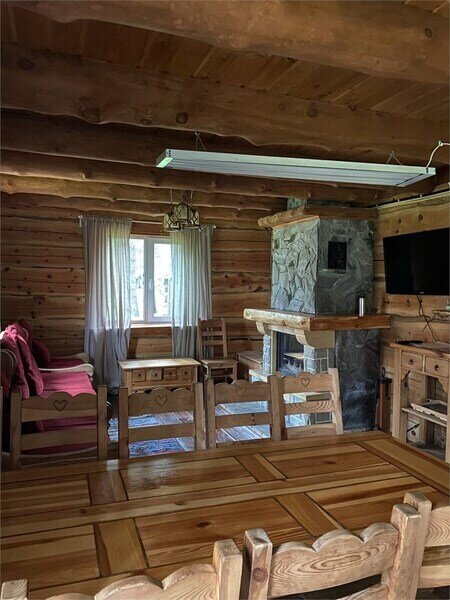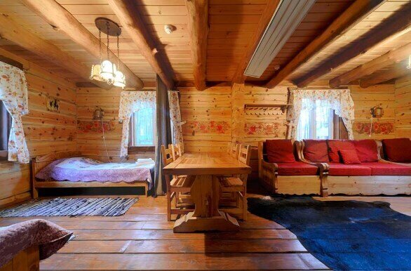 «Царский терем» — уютный и удобный коттедж для большой компании или семьи. На двух этажах разместились: просторная гостиная с камином, кухонный уголок, две спальни и два санузла.