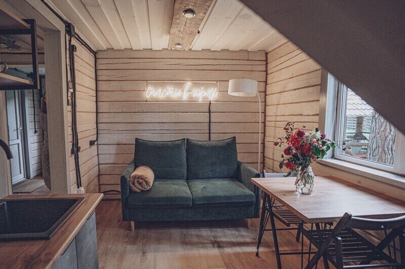 Дизайнерский интерьер домиков выполнен в сканди-стиле.