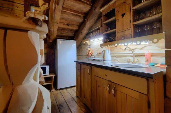 Кухонная зона находится в холле первого этажа и оборудована холодильником, микроволновой печью, электрической плиткой, а также набором всей необходимой посуды.